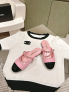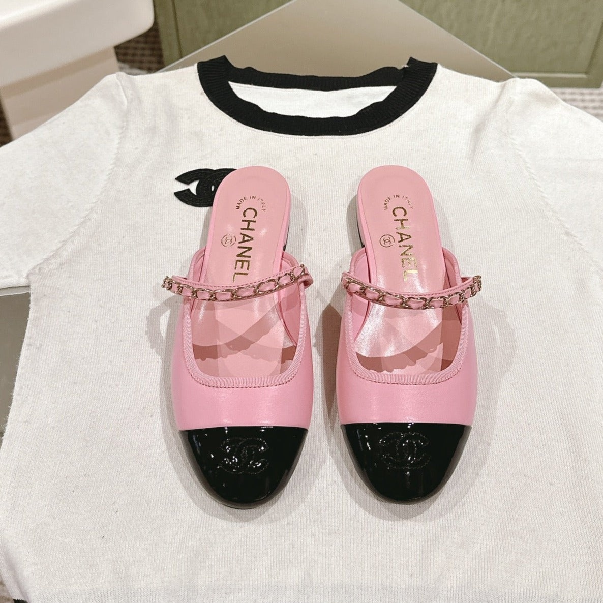 cc mule leather chain pink calfskin black patent calfskin