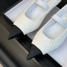 mary jane 35 pointed toe white tweed black grosgrain