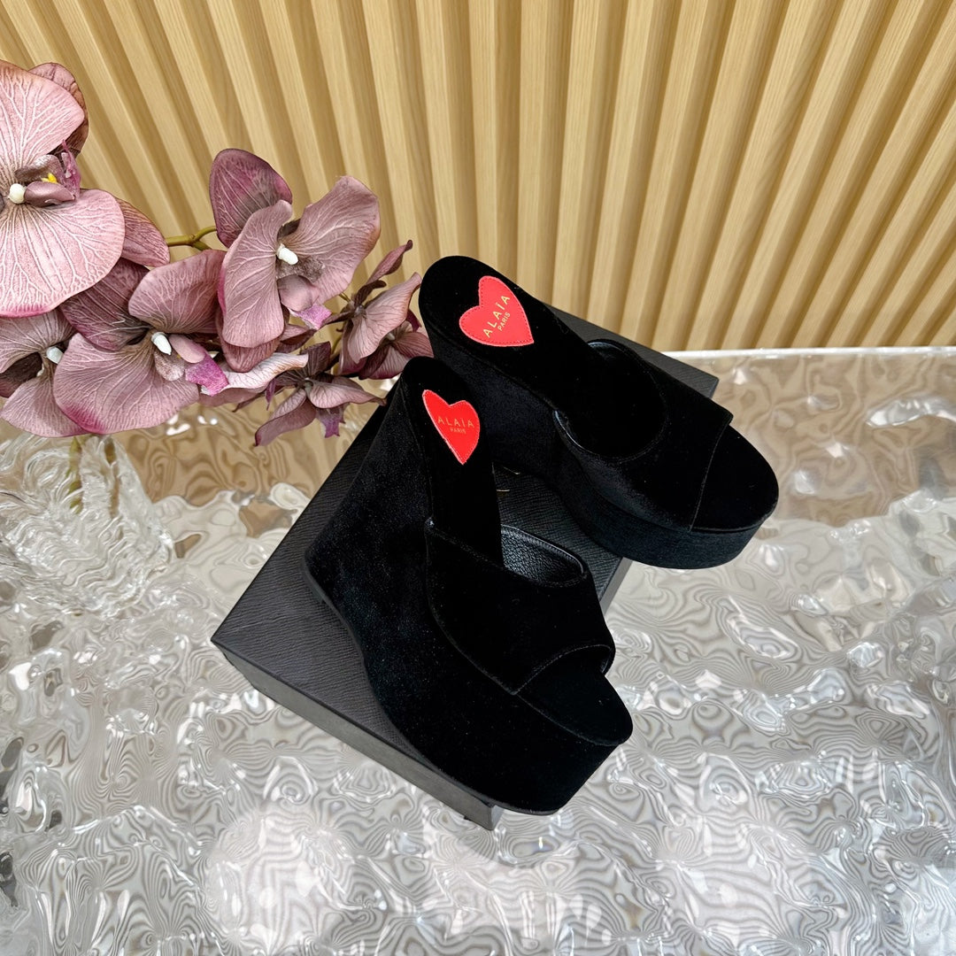 ALAIA PLATFORM WEDGE IN BLACK VELVET WITH HEART EMBROIDERED