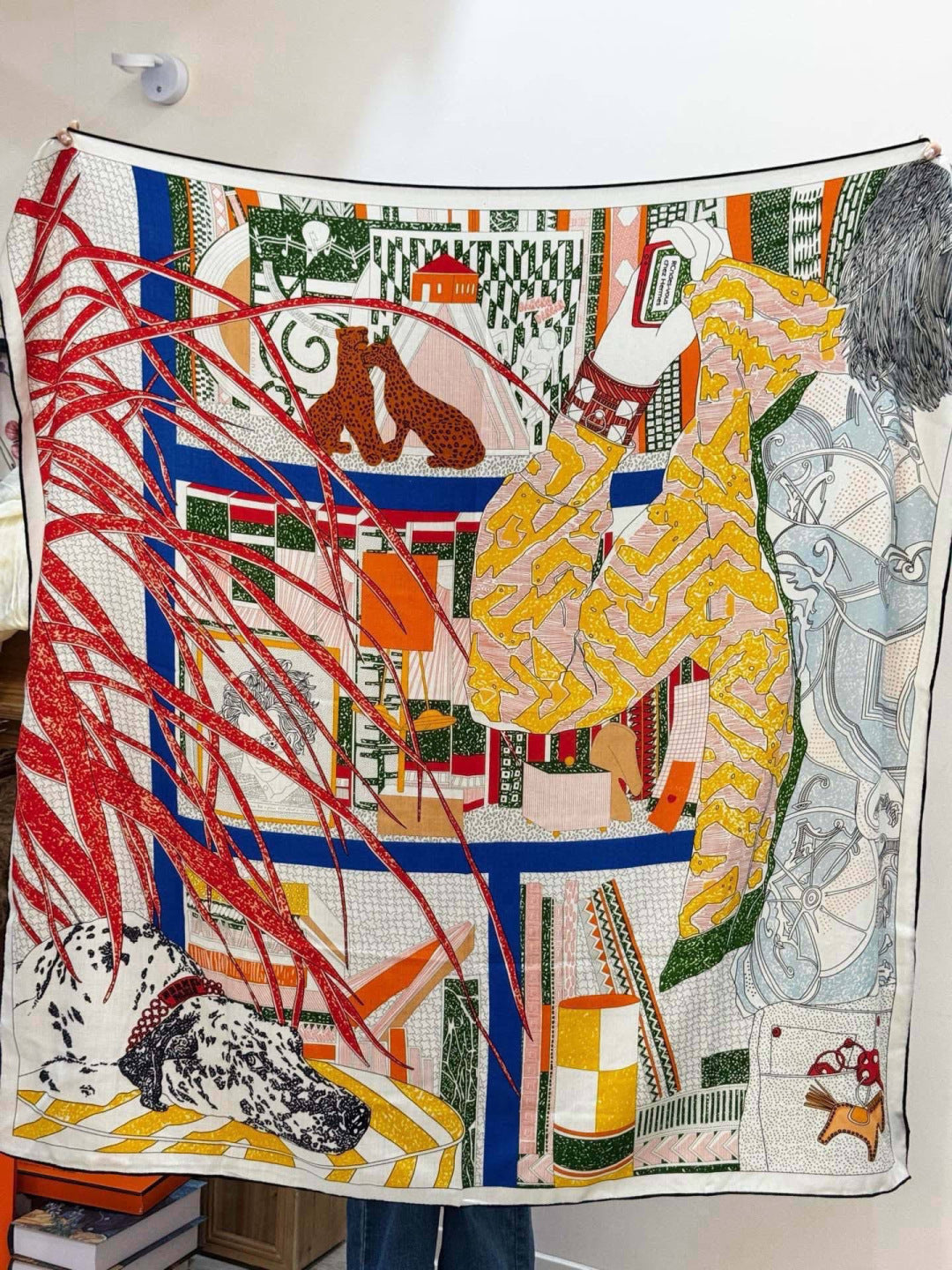 HM 25s Equestrianism Scarf 135cm Cream Black Cashmere Silk 970962