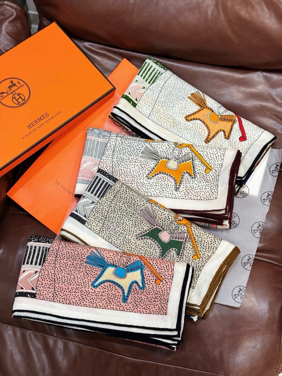 HM 25s Checkered Horse Scarf 140cm Blach White Cashmere Silk 970934