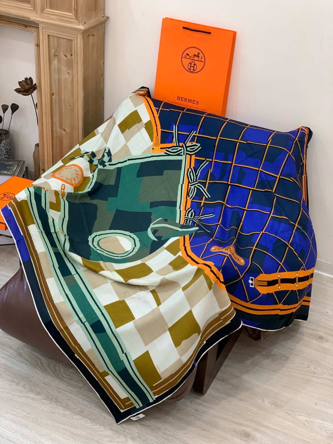 HM 25s Horse Reversible Scarf 140cm Blue Brown Cashmere Silk 967377