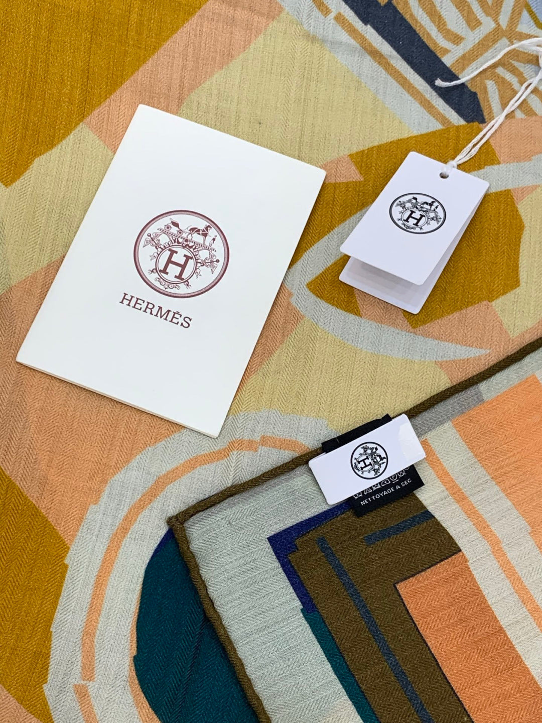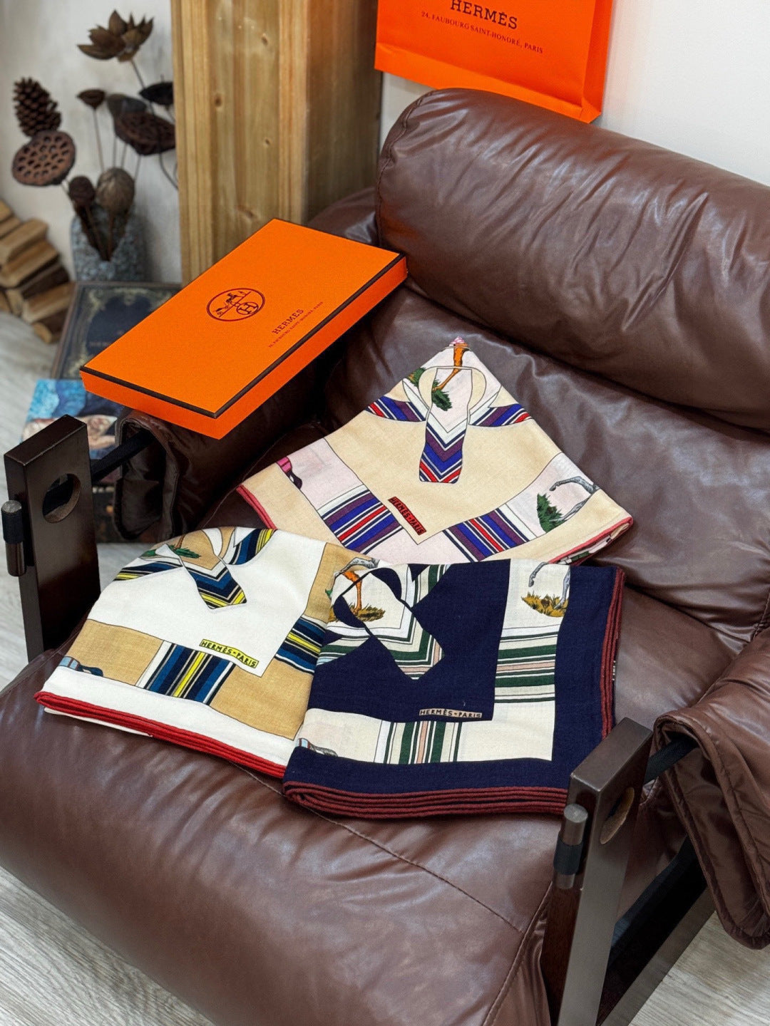 HM 25s Equestrianism Scarf 135cm Camel Brown Blue Cashmere Silk 970963
