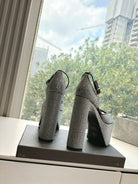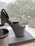 PLATFORM ANKLE STRAP HEELS IN BLACK ATTACHED RHINESTONES CALFSKIN