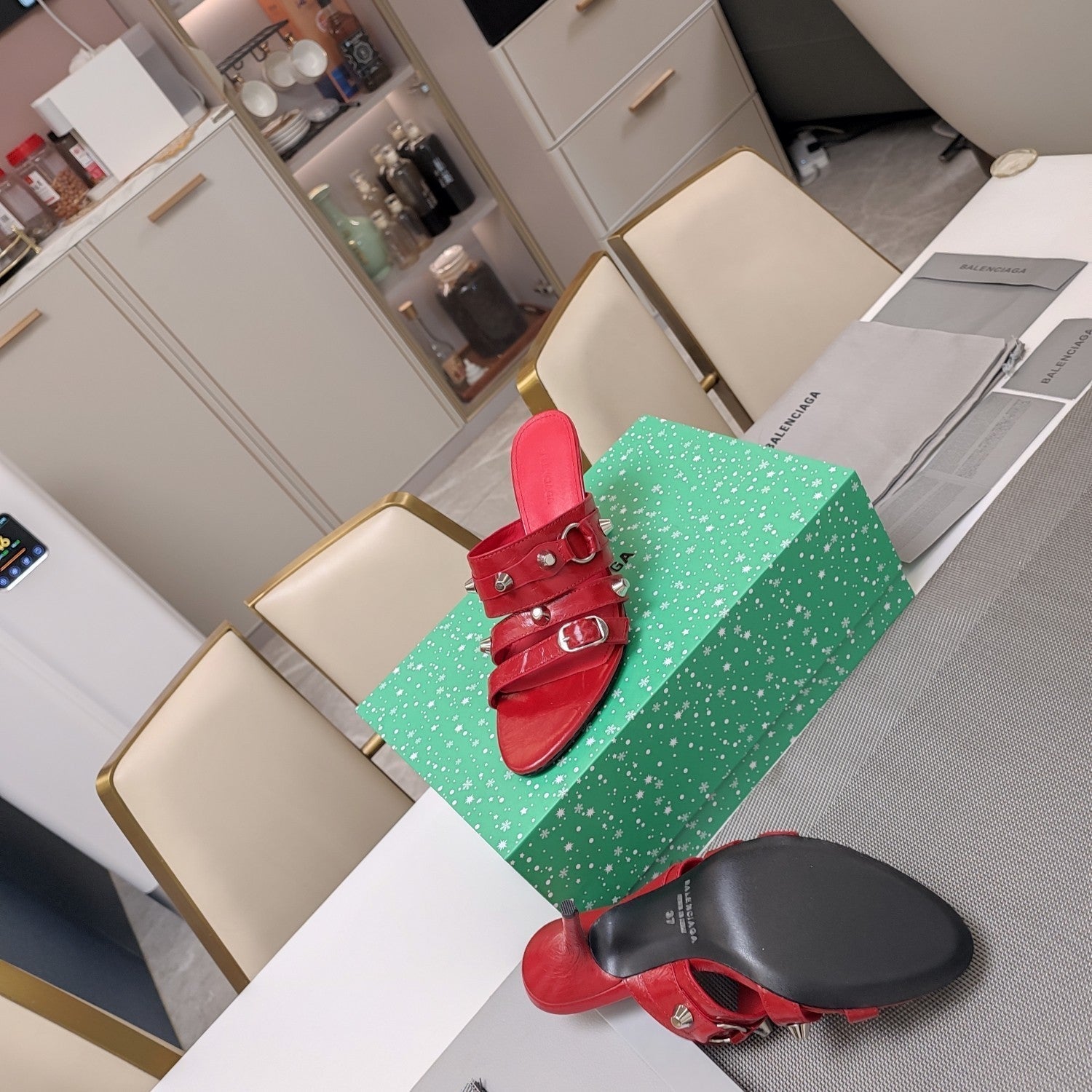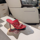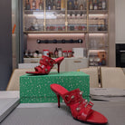 STRAPPY HIGH-HEELED SANDALS IN RED STUDDED WAX-OIL SHEEPSKIN