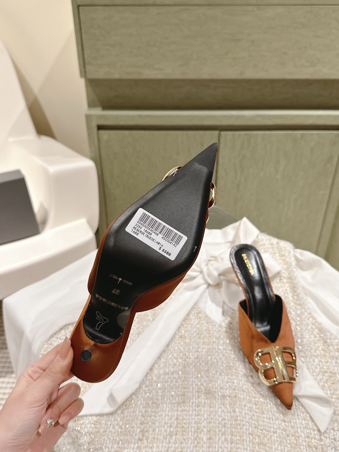 POINTED BB GOLD BUCKLE HIGH MULES IN BROWN RUST SILK