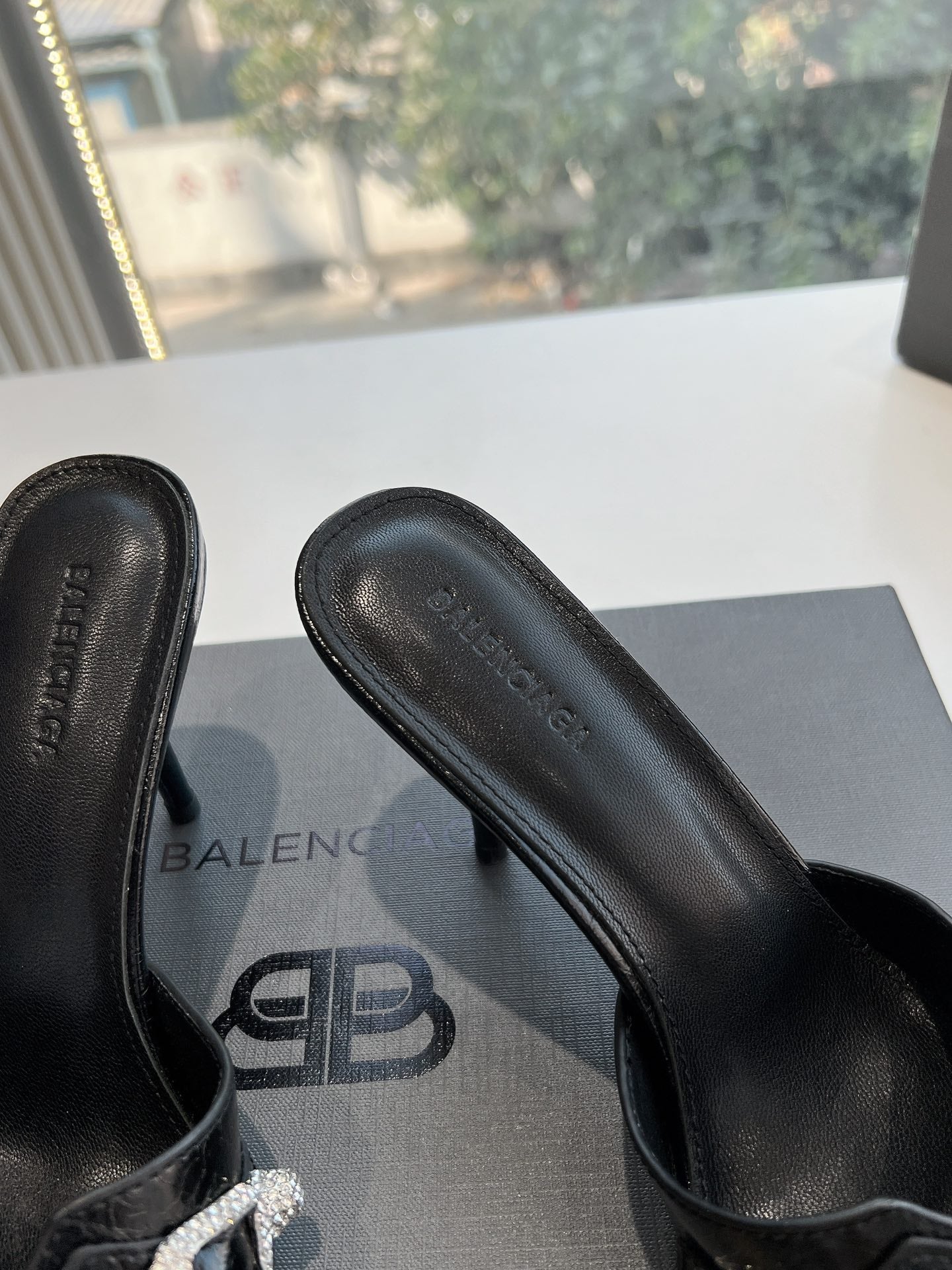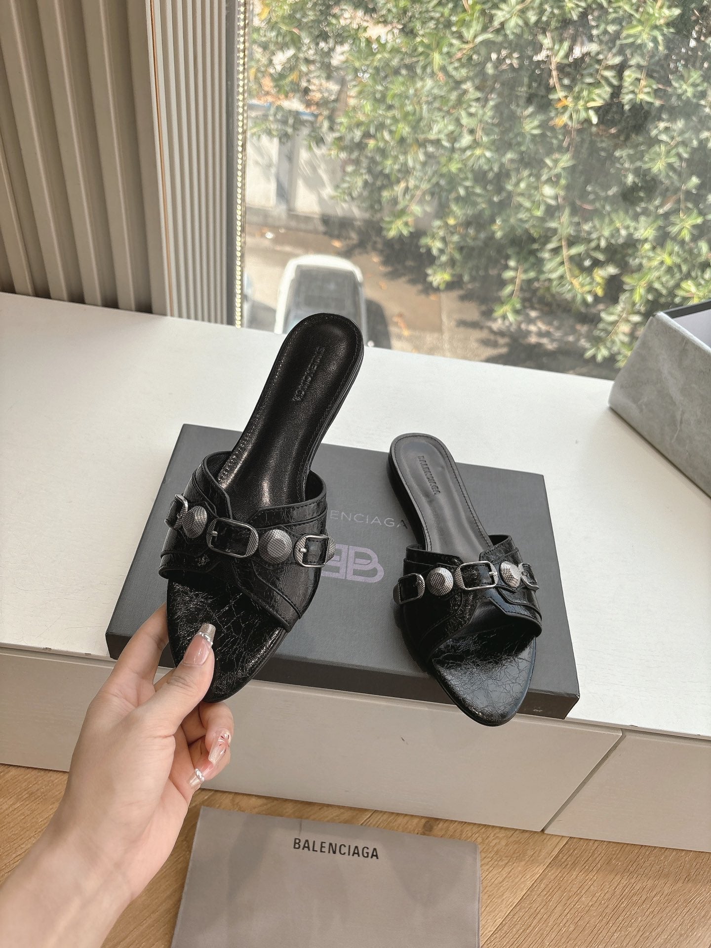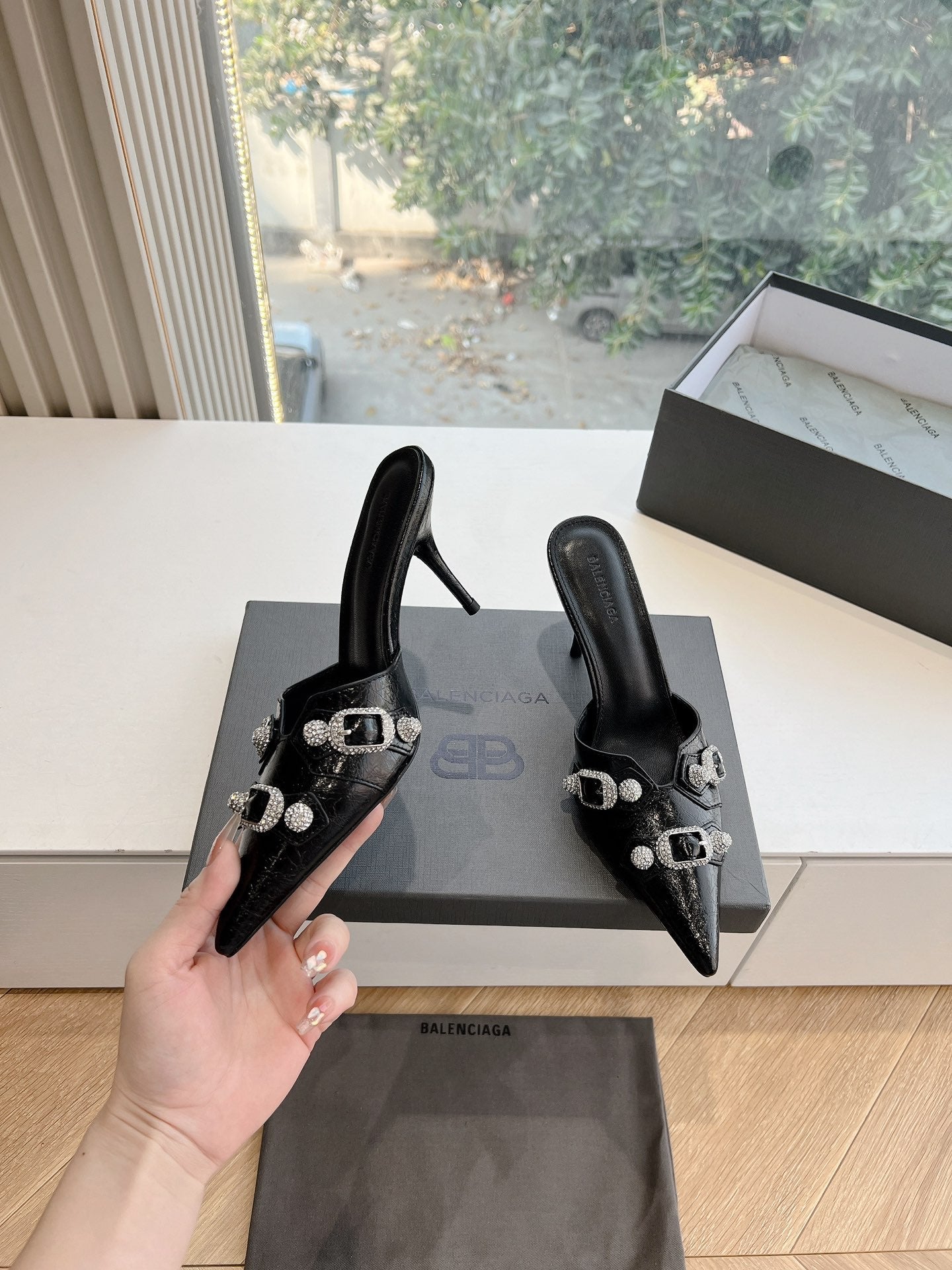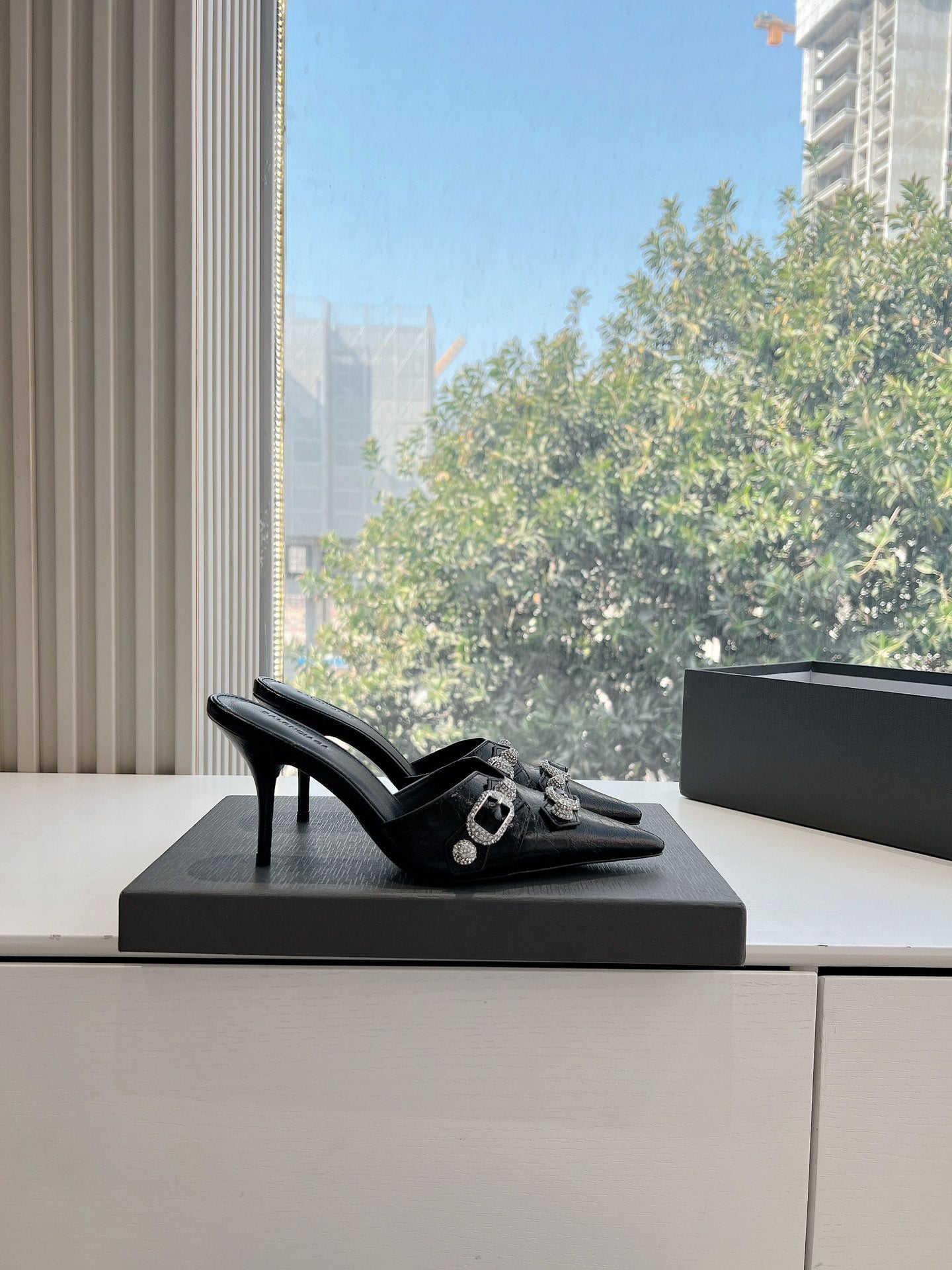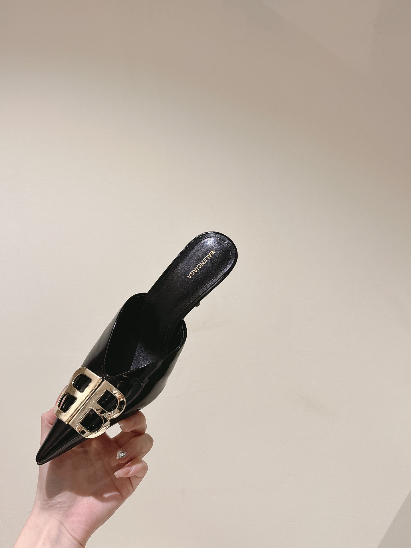 POINTED BB GOLD BUCKLE HIGH MULES IN BLACK PATENT CALFSKIN