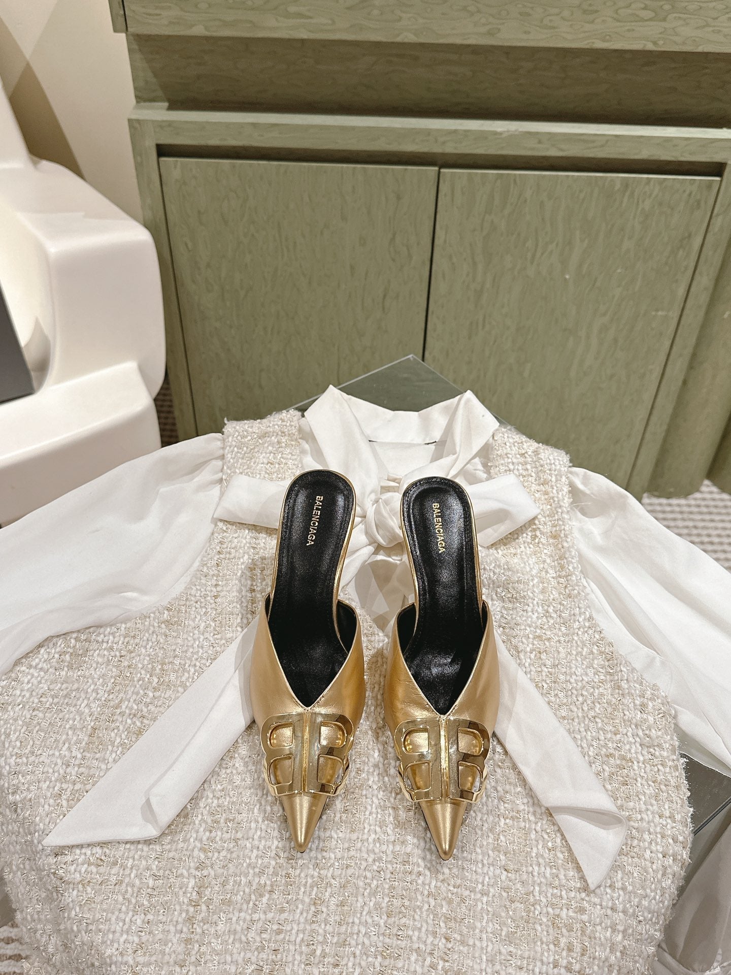 POINTED BB GOLD BUCKLE HIGH MULES IN GOLD METALLIC CALFSKIN