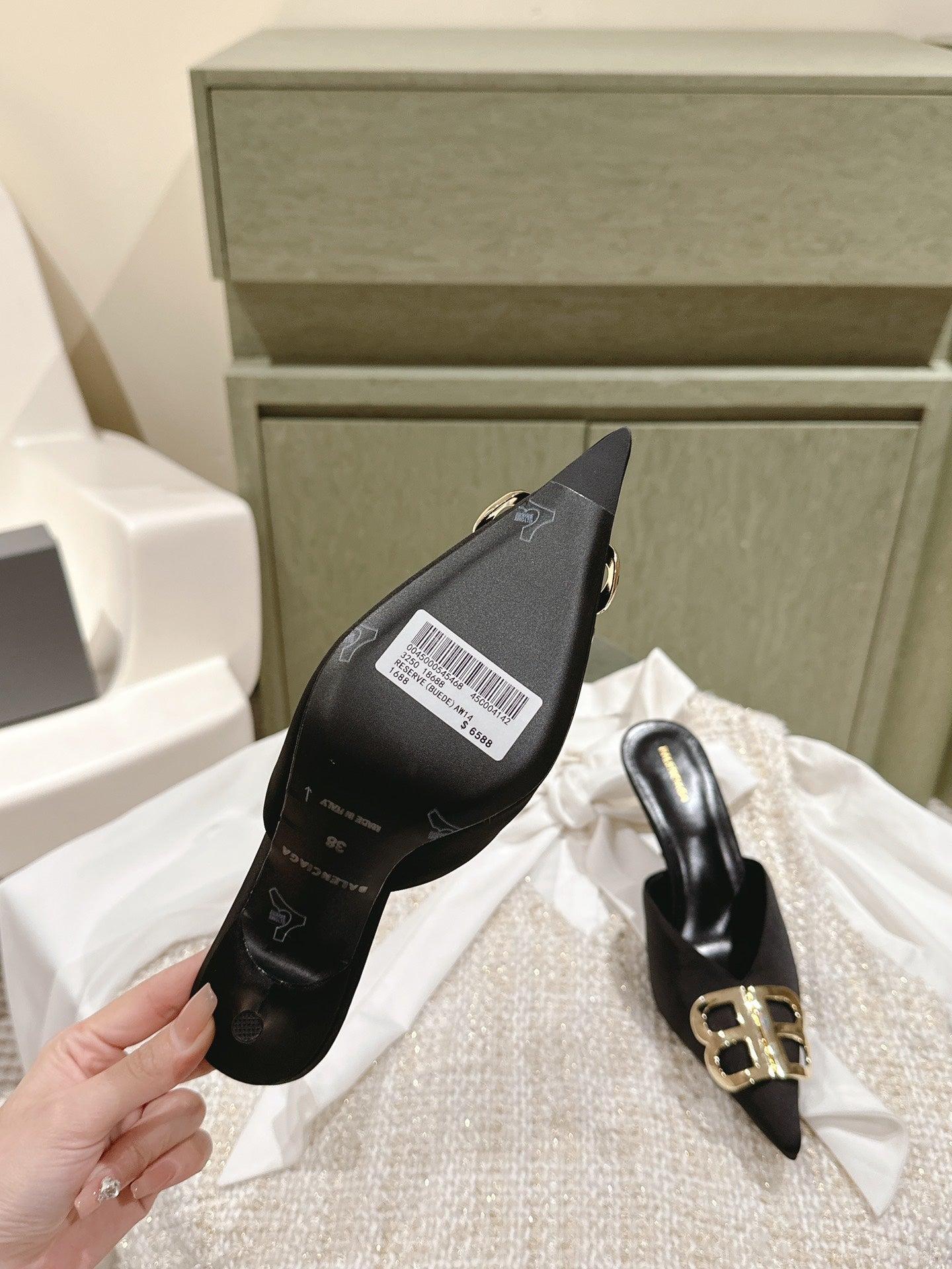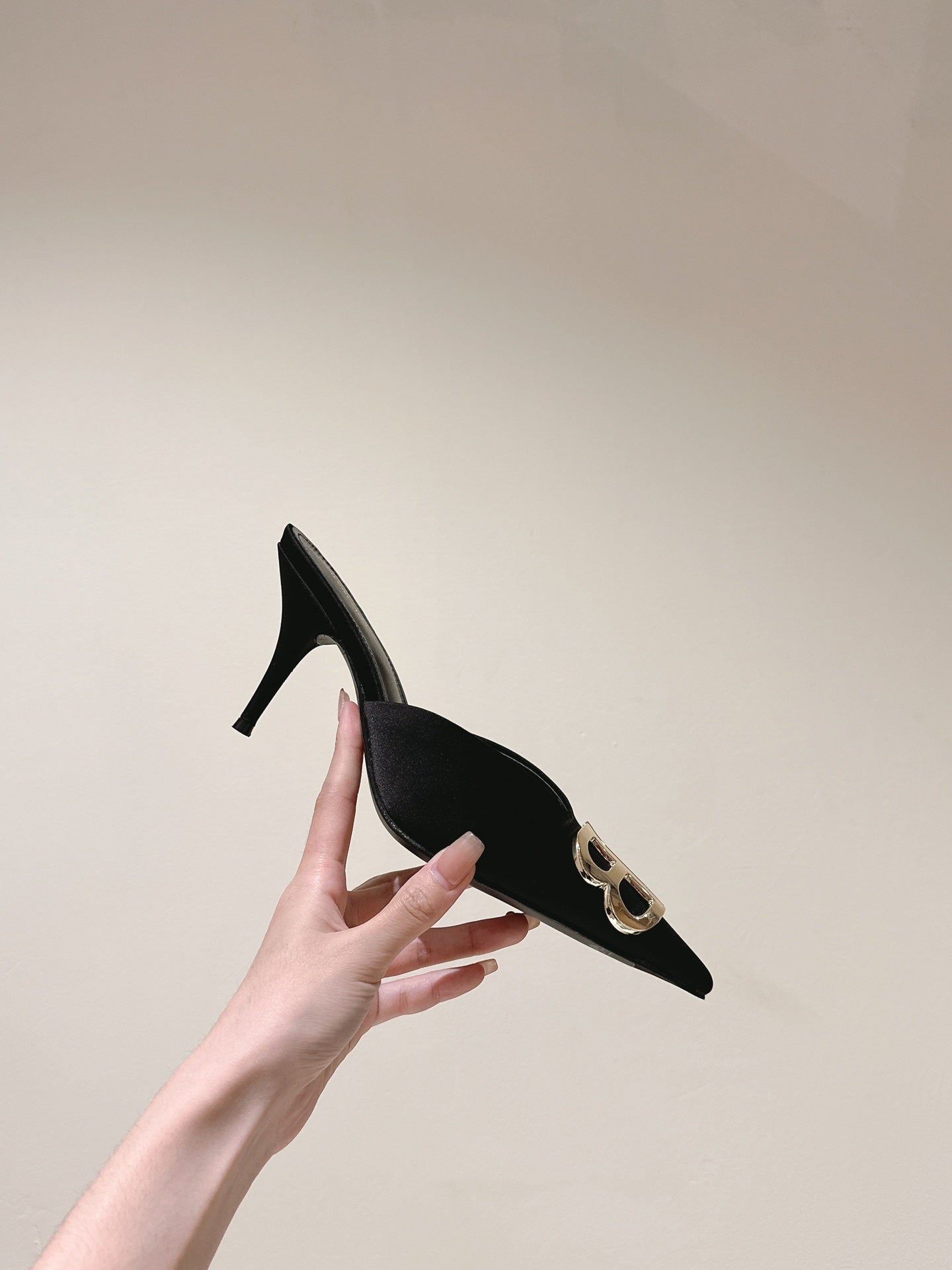 POINTED BB GOLD BUCKLE HIGH MULES IN BLACK SILK