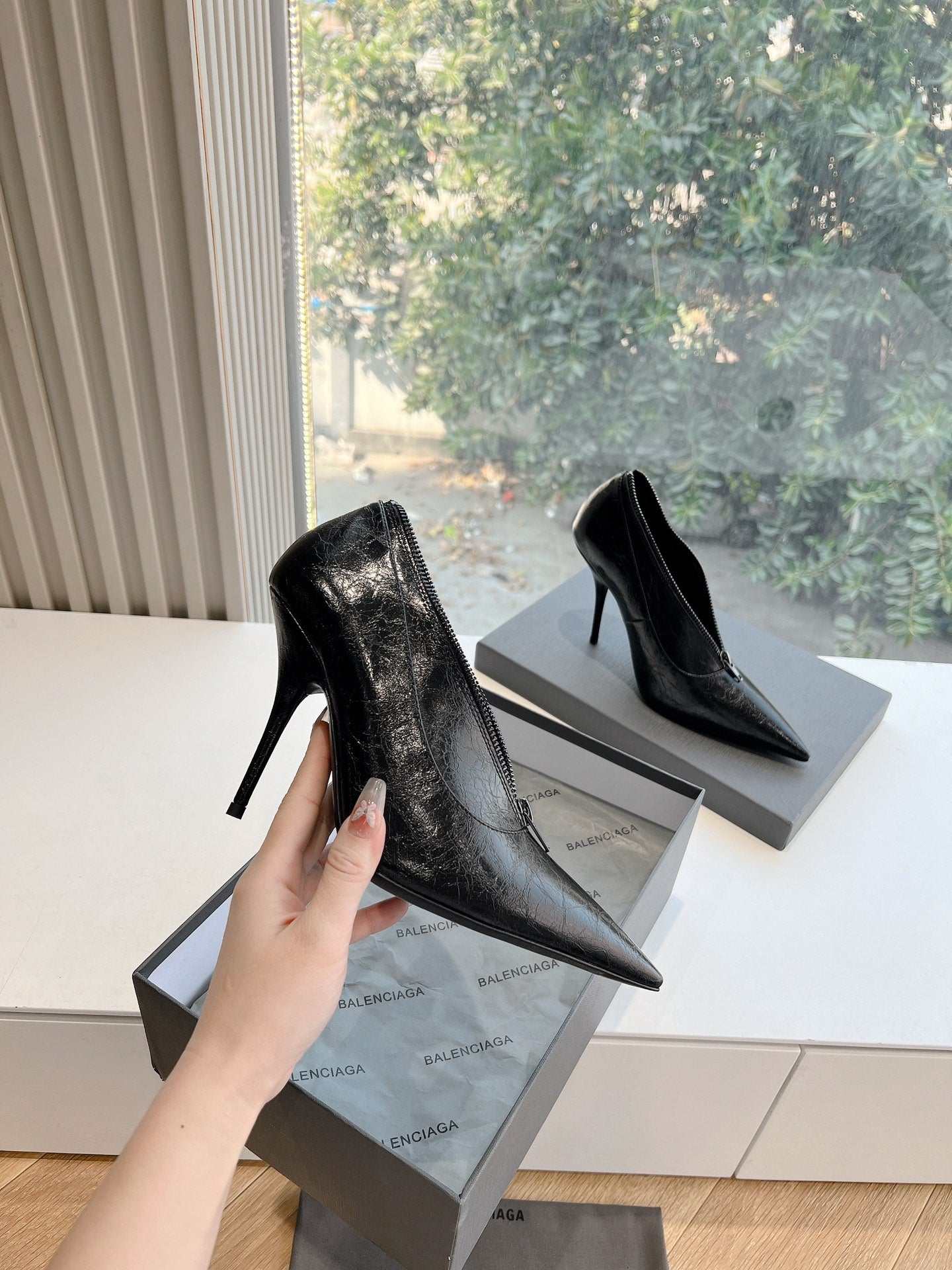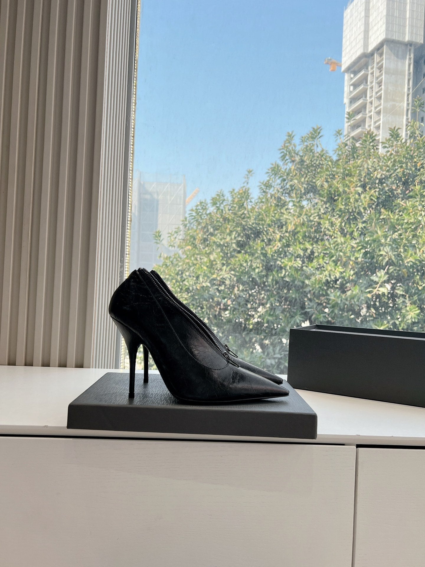 ZIPPER POINTED-TOE HIGH PUMPS IN BLACK WAX-OIL SHEEPSKIN