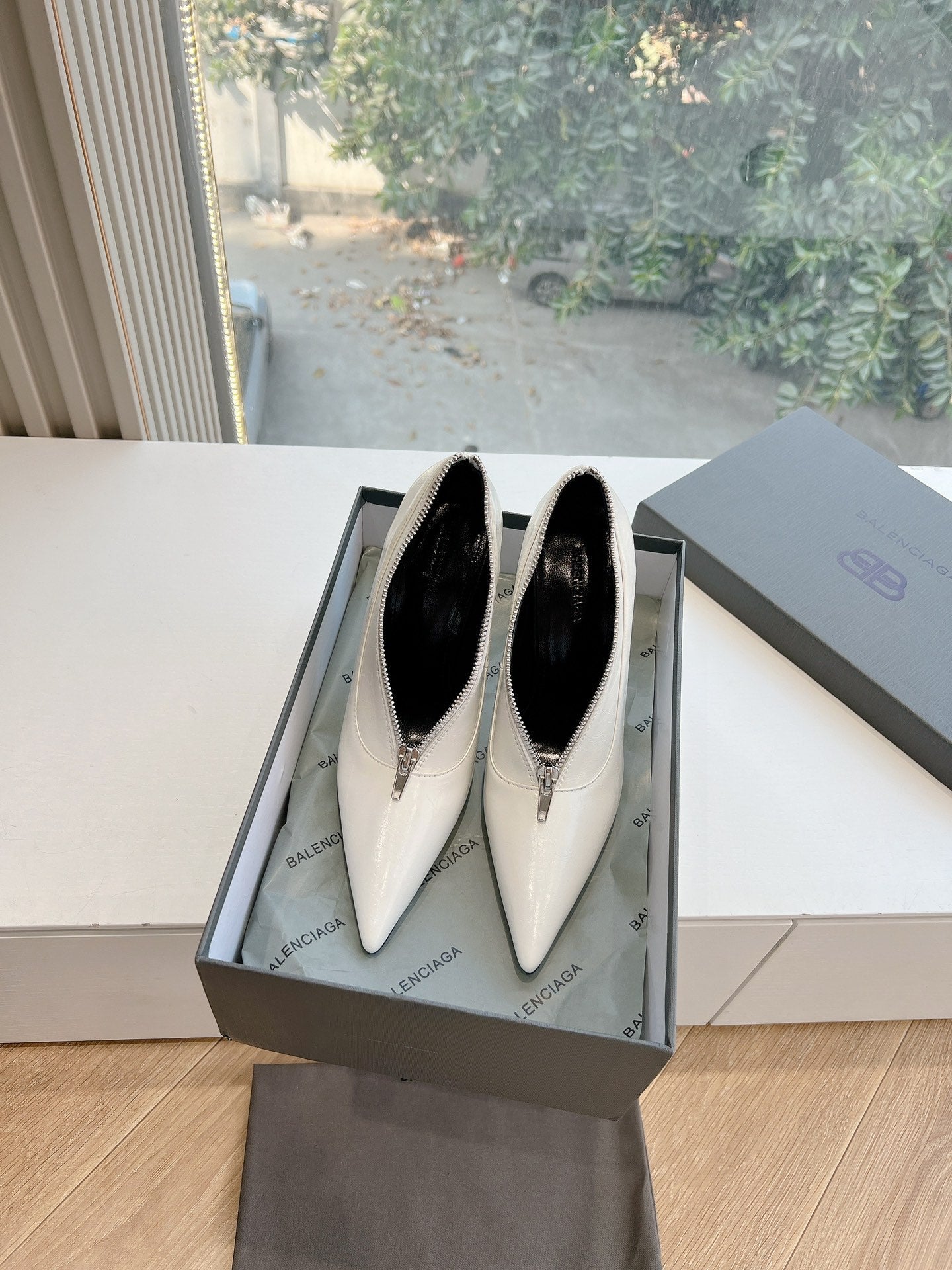 ZIPPER POINTED-TOE HIGH PUMPS IN WHITE WAX-OIL SHEEPSKIN