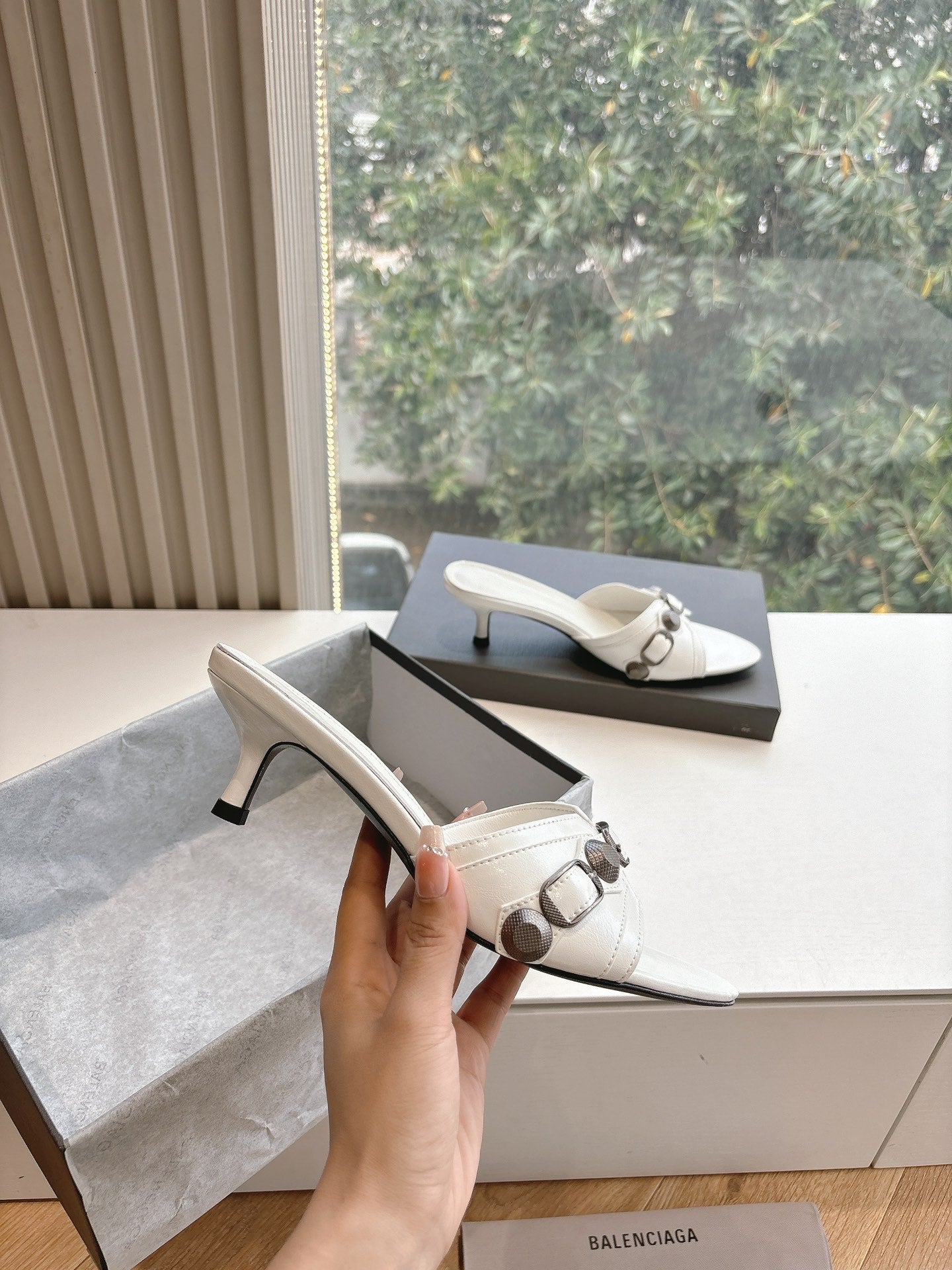CRYSTAL BUCKLE WHITE CALFSKIN HEELED MULES