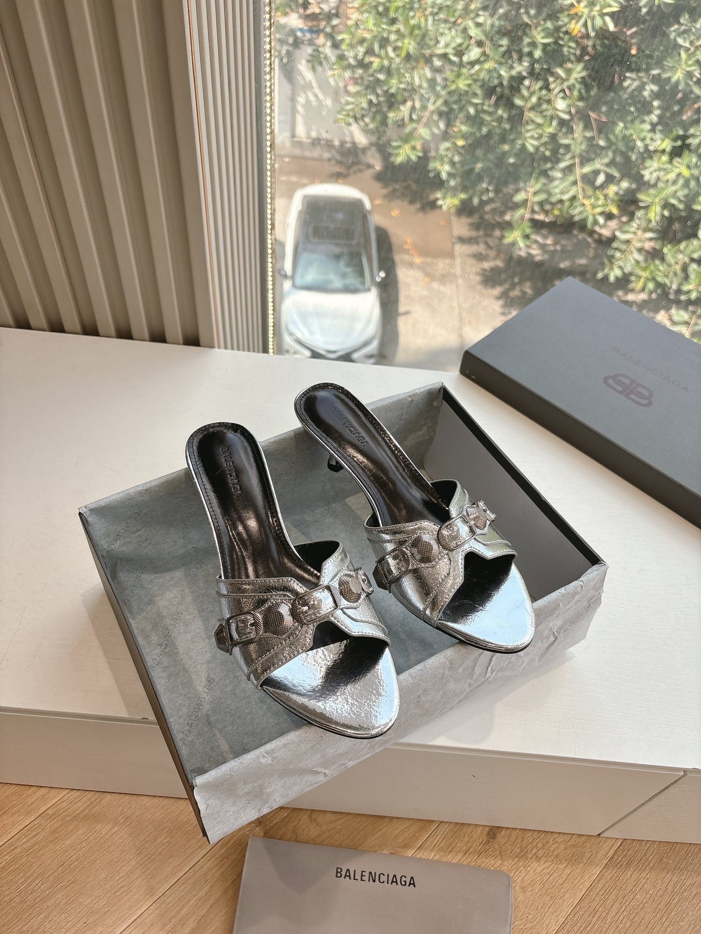 CAGOLE MID-HEEL MULES IN SILVER METALLIC CALFSKIN