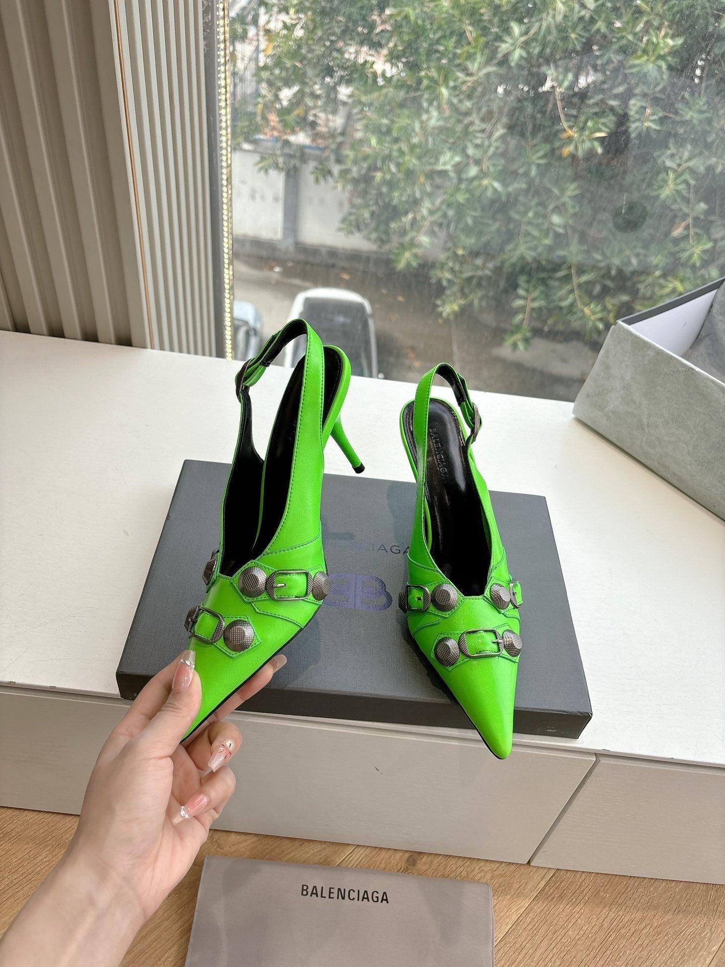 CAGOLE HIGH SLINGBACK IN NEON GREEN GLOSSY CALFSKIN