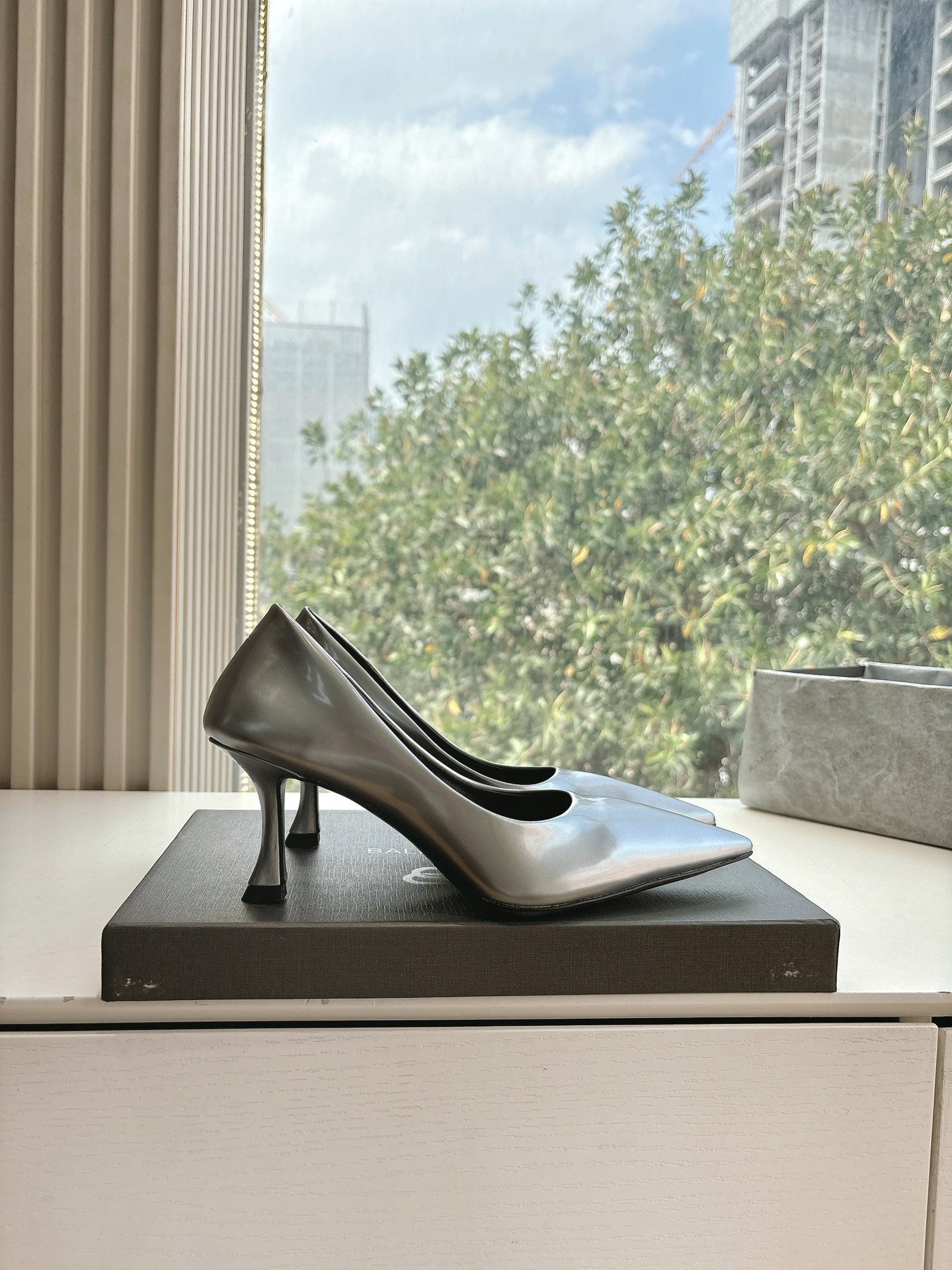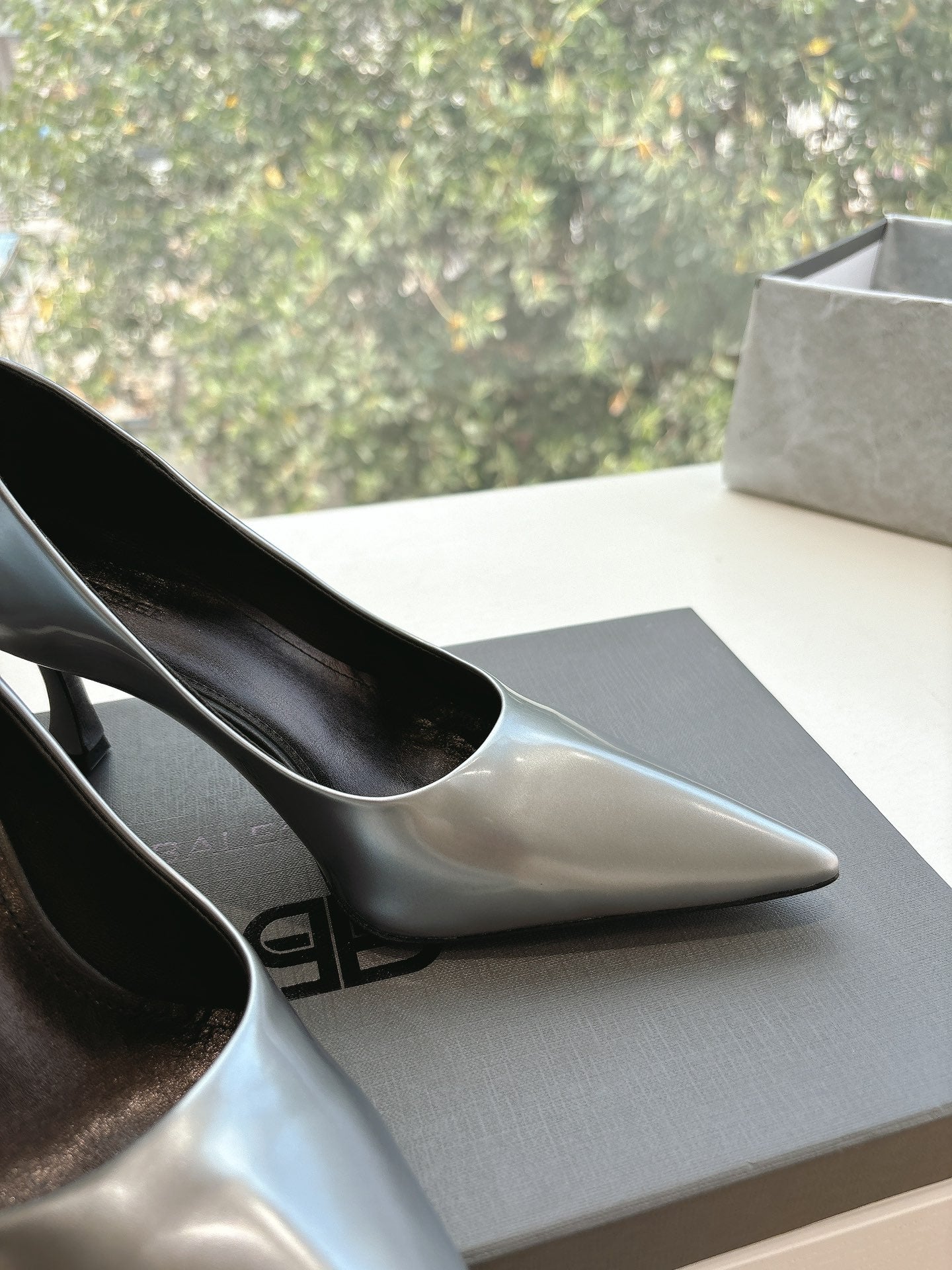HIGH PUMPS IN RHINO GRAY PATENT CALFSKIN