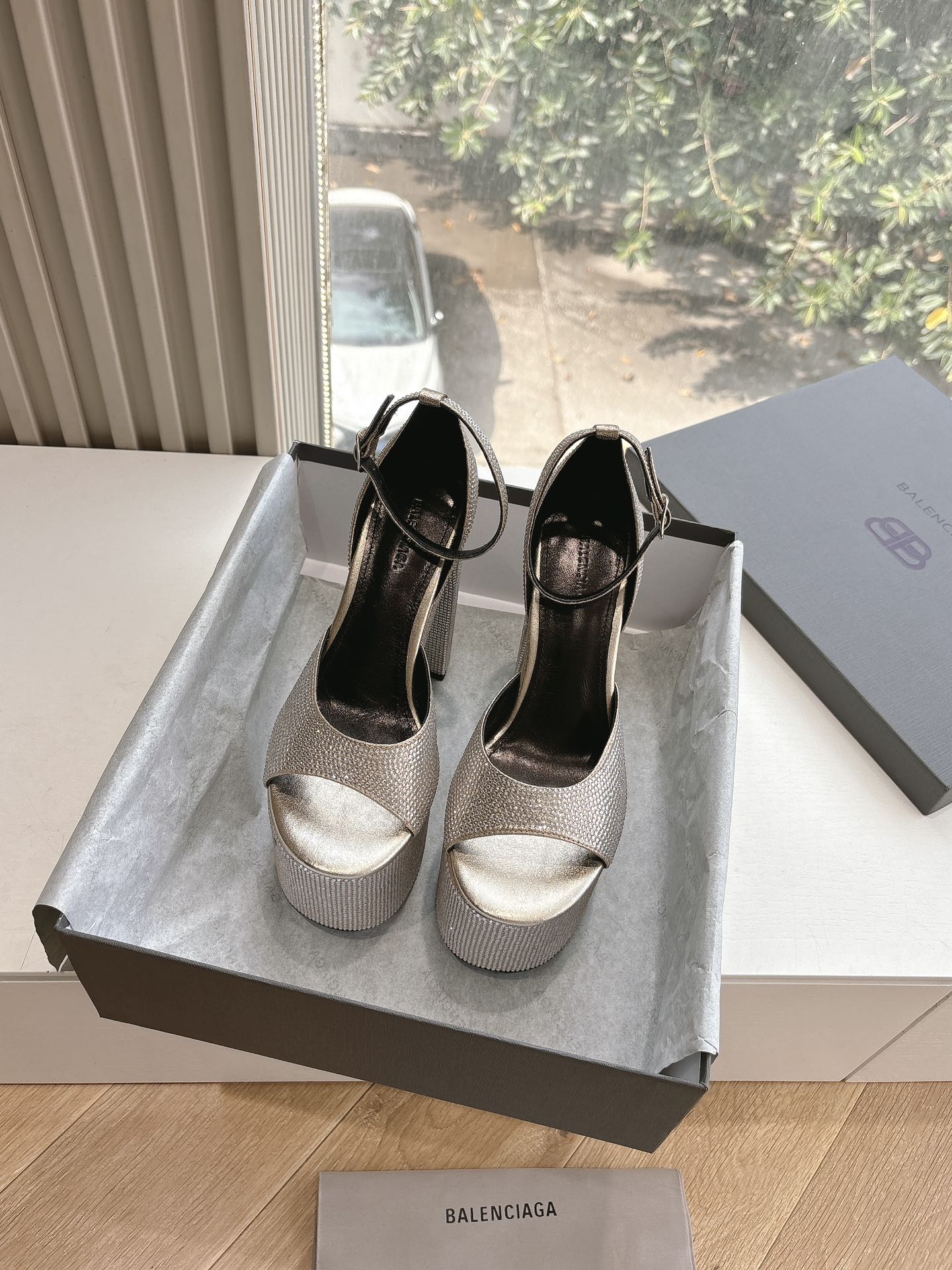 PLATFORM ANKLE STRAP HEELS IN SILVER METALLIC ATTACHED RHINESTONES CALFSKIN