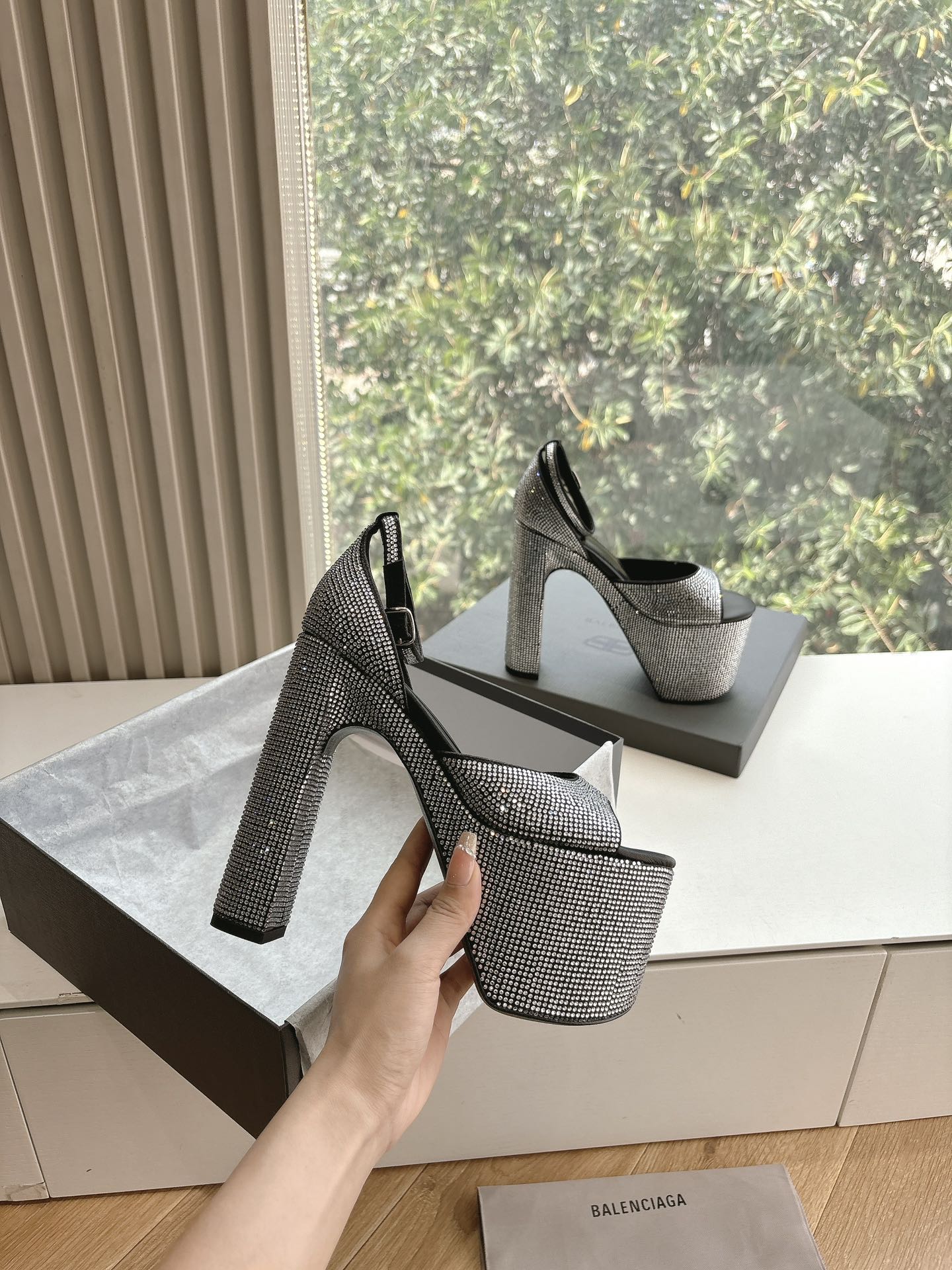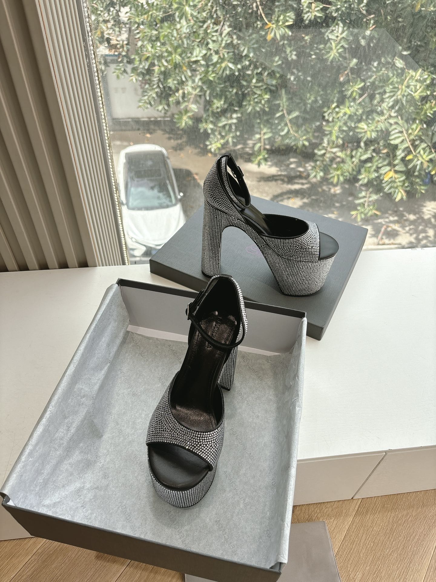 PLATFORM ANKLE STRAP HEELS IN BLACK ATTACHED RHINESTONES CALFSKIN