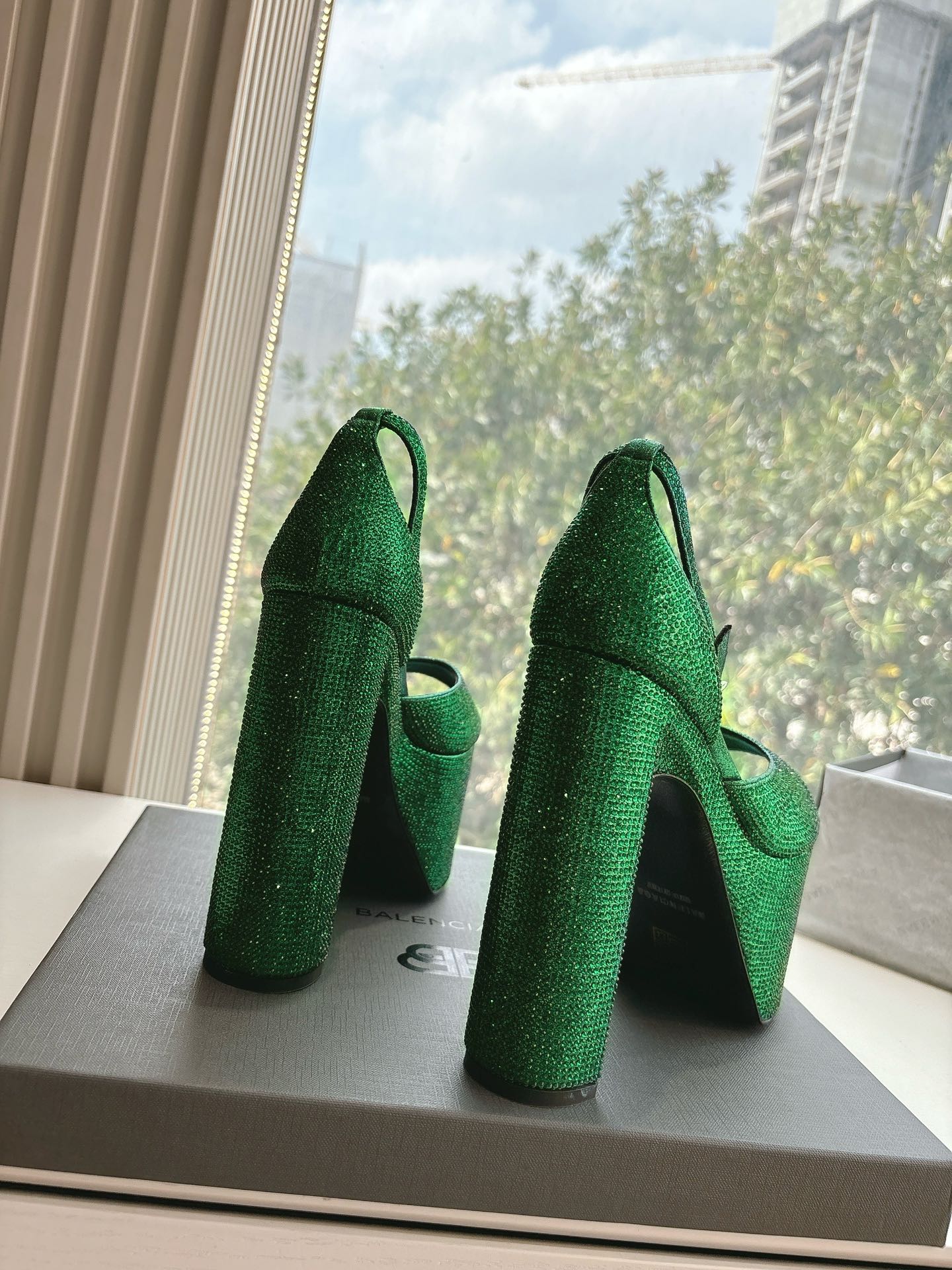 PLATFORM ANKLE STRAP HEELS IN GREEN METALLIC ATTACHED RHINESTONES CALFSKIN