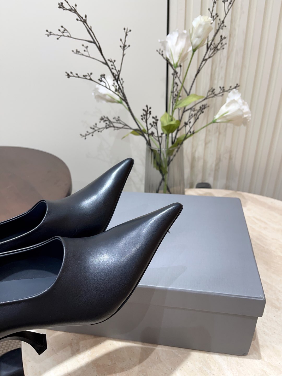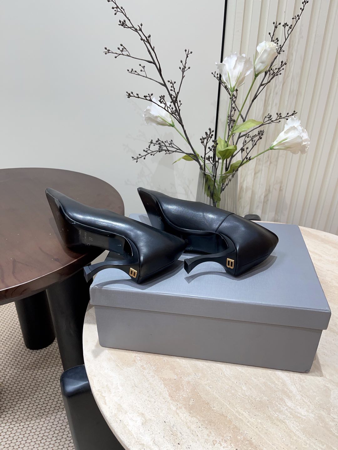 CURVED HEEL SHALLOW MOUTH PUMPS IN BLACK CALFSKIN