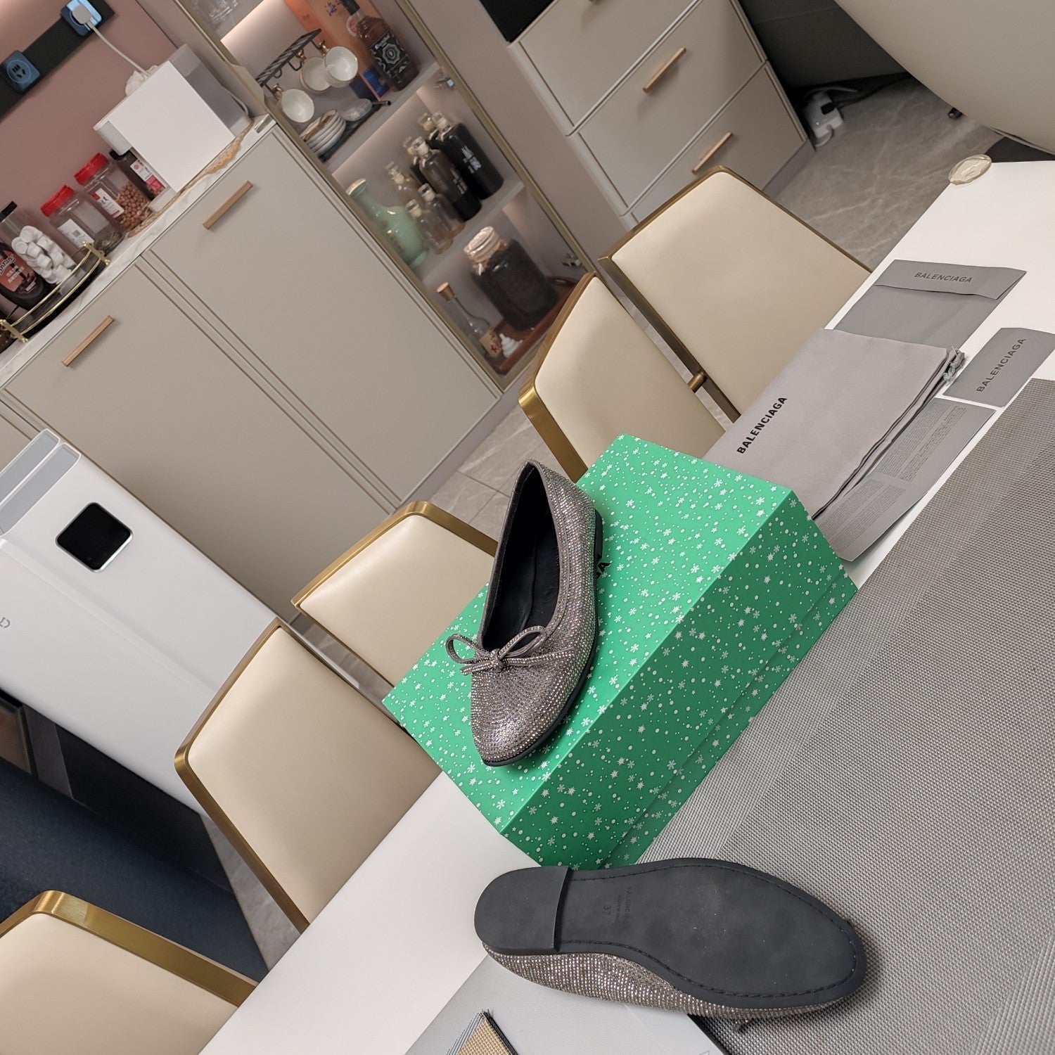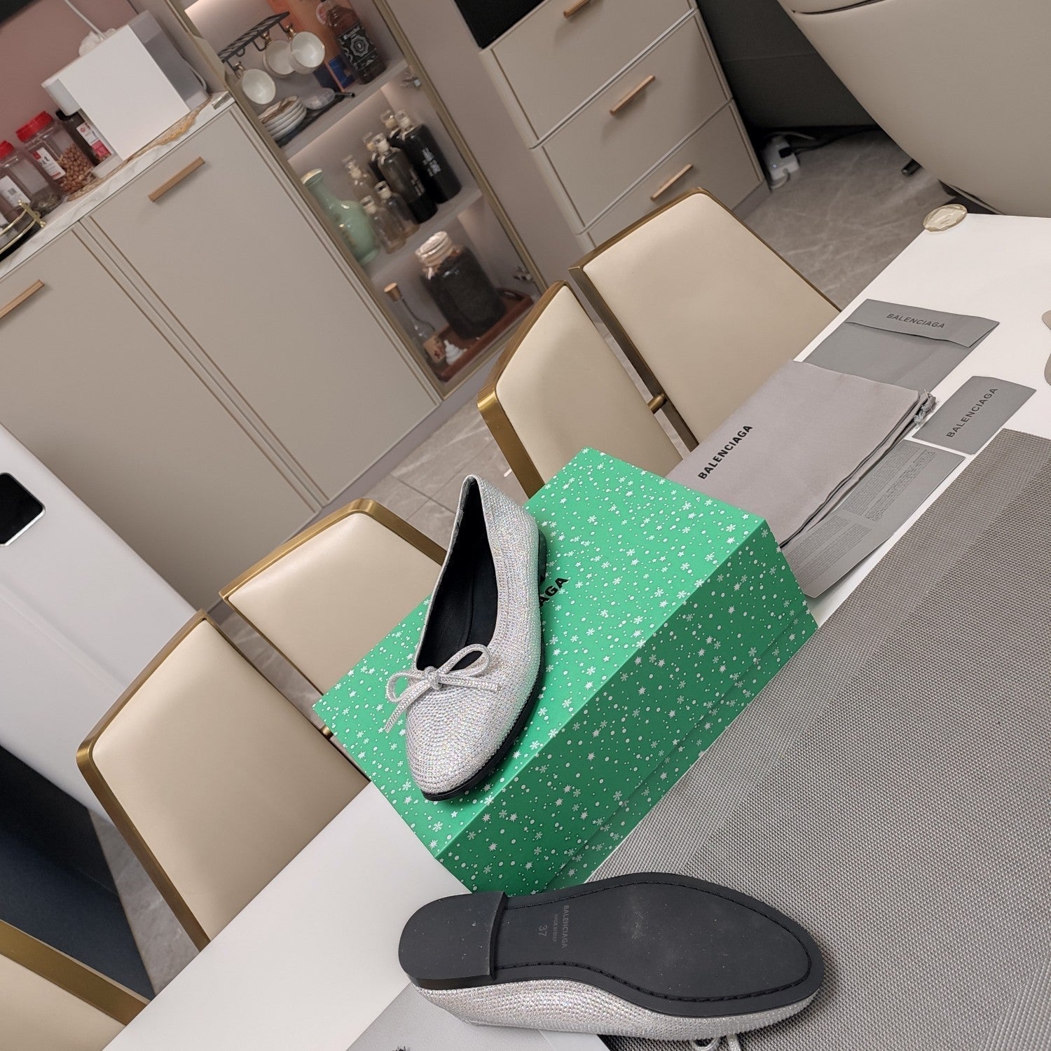 RHINESTONE BALLET FLATS WITH BOW IN GRAY SHEEPSKIN