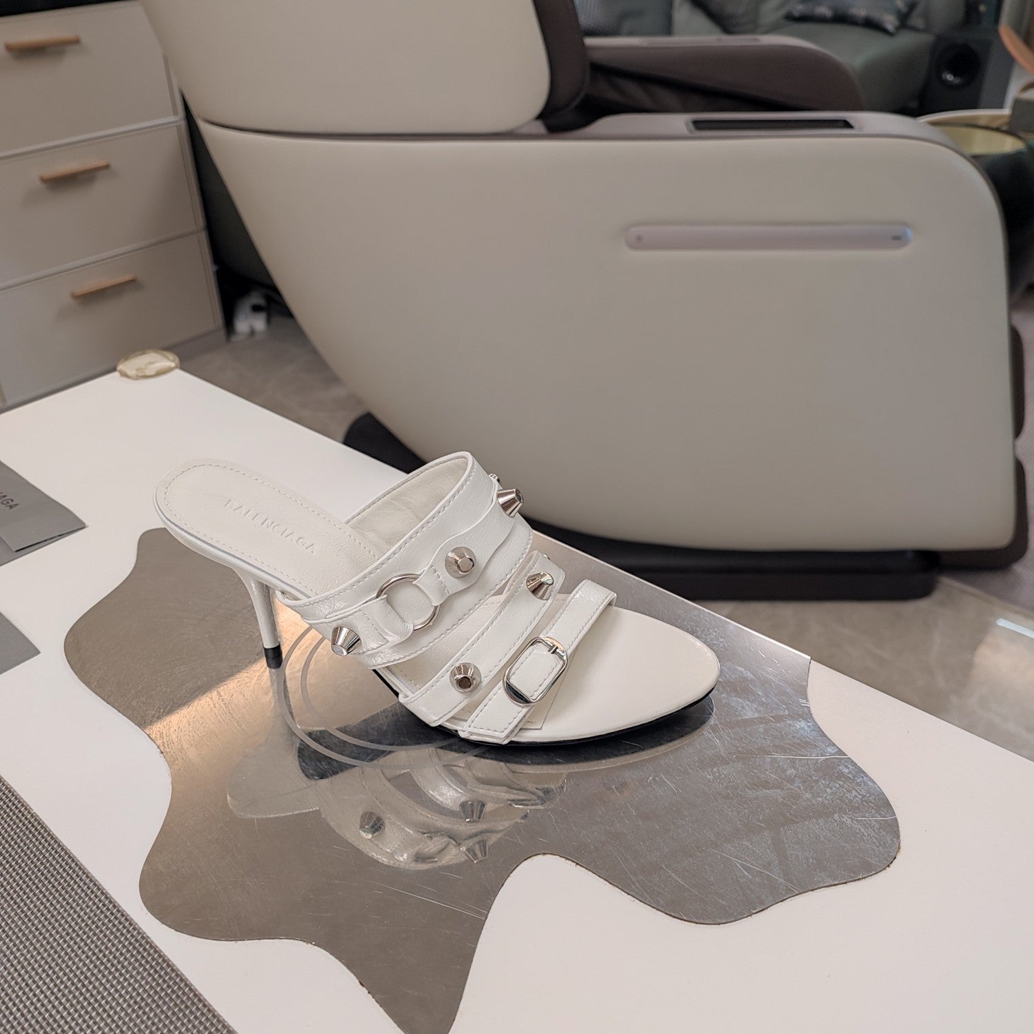 STRAPPY HIGH-HEELED SANDALS IN WHITE STUDDED WAX-OIL SHEEPSKIN
