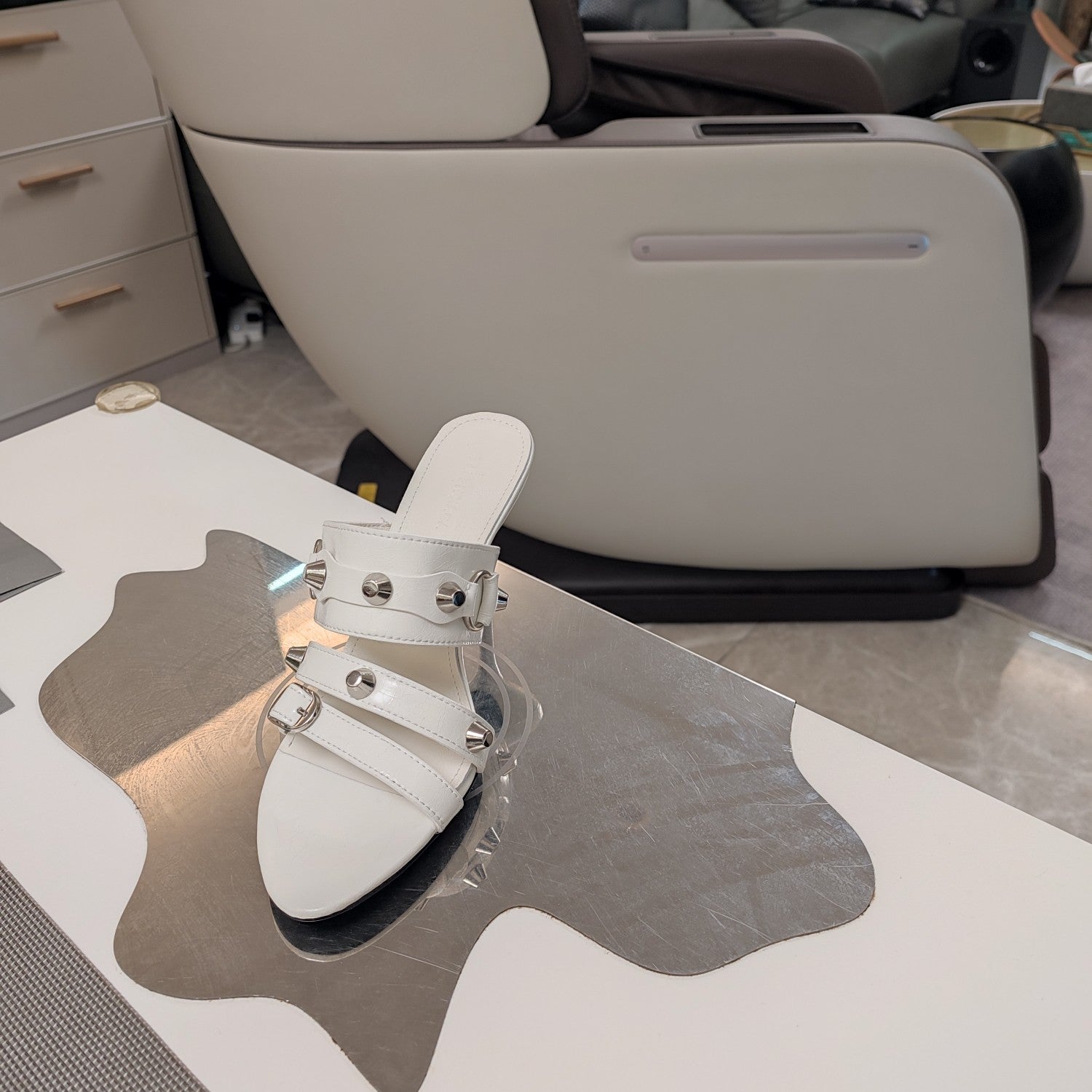 STRAPPY MEDIUM HEELED SANDALS IN WHITE STUDDED WAX-OIL SHEEPSKIN