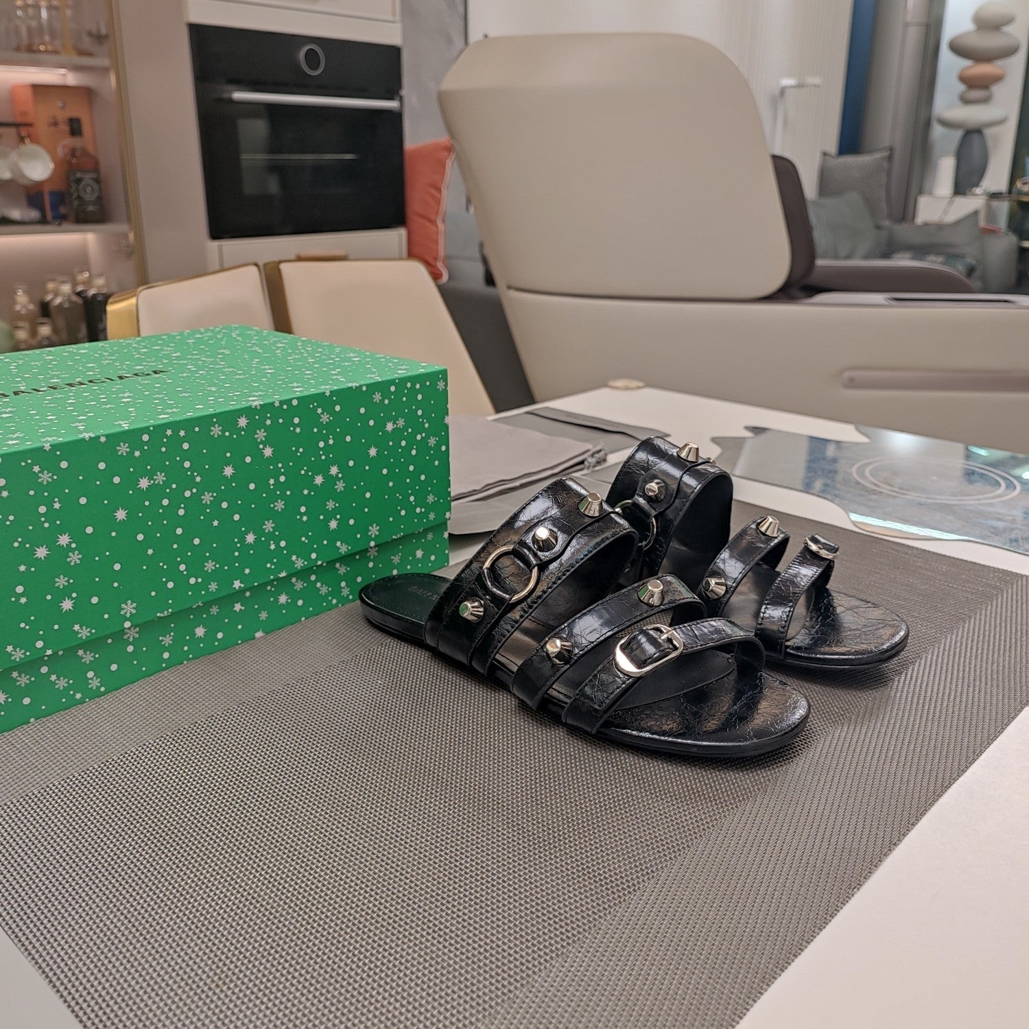STRAPPY FLAT SANDALS IN BLACK STUDDED WAX-OIL SHEEPSKIN