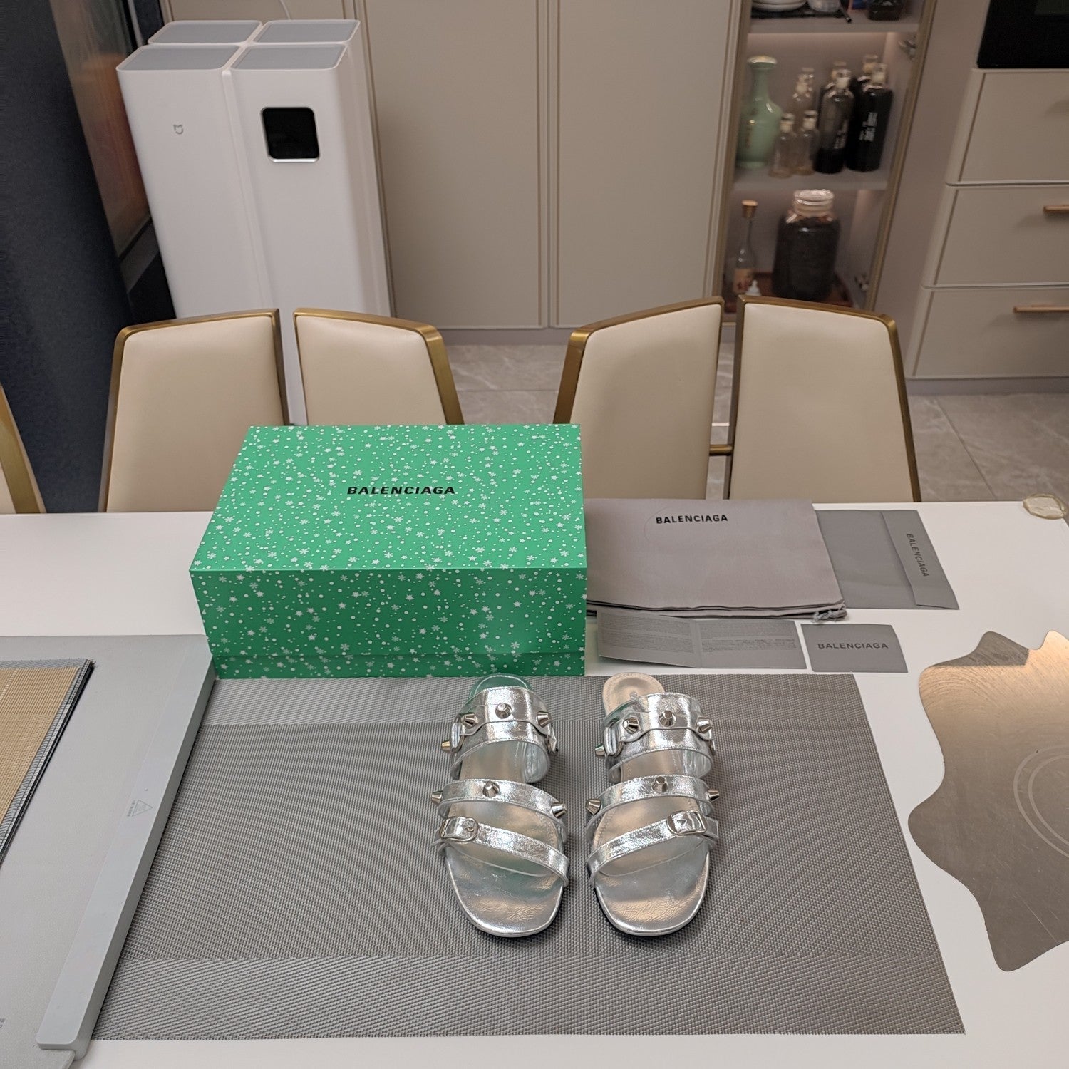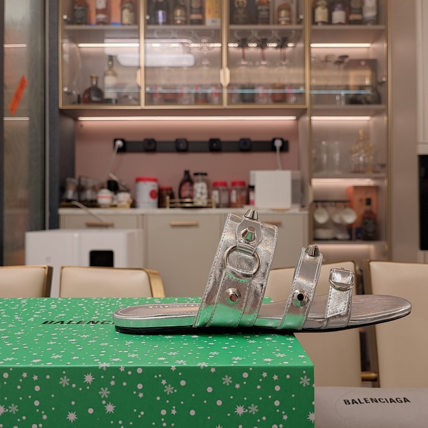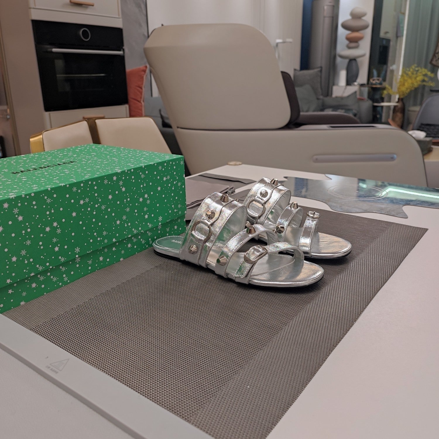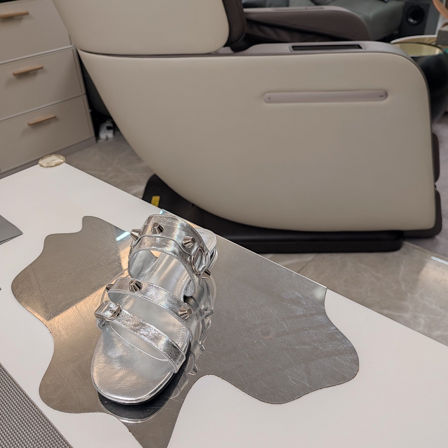STRAPPY FLAT SANDALS IN SILVER STUDDED WAX-OIL SHEEPSKIN