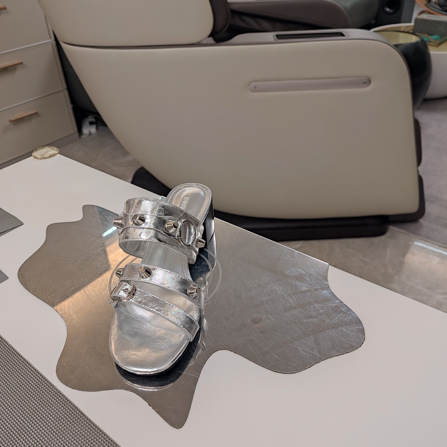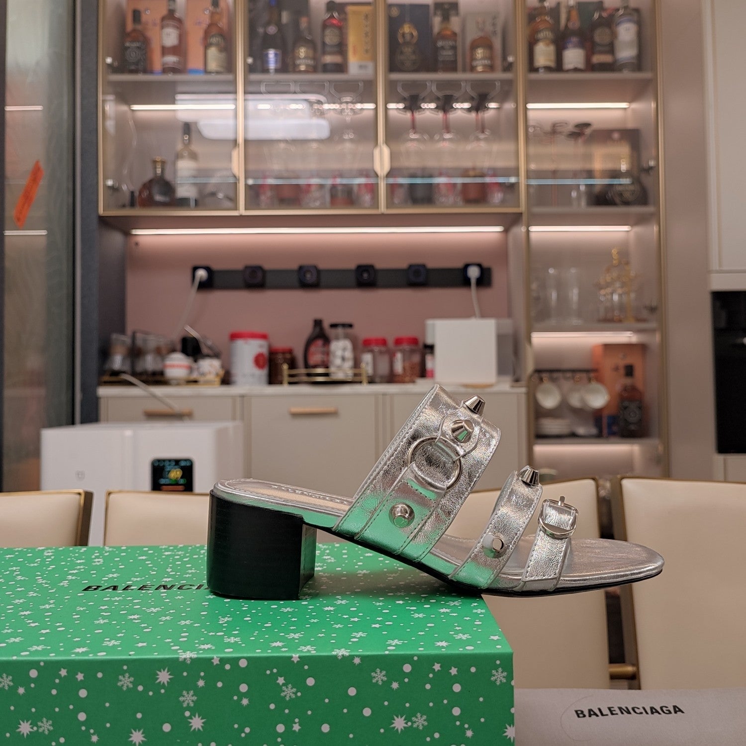 CAGOLE POINTED HIGH MULES IN SILVER SHINY CALFSKIN