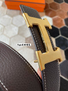 HM CONSTANCE BELT BUCKLE & REVERSIBLE CHOCOLATE BROWN LEATHER STRAP 38MM GOLD HARDWARE