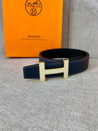 HM CONSTANCE BELT BUCKLE & REVERSIBLE NAVY BLUE LEATHER STRAP 38MM GOLD HARDWARE