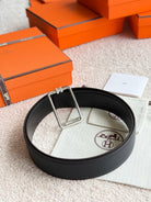 HM Silver Tube H Buckle Belt 38mm Black Leather 187780