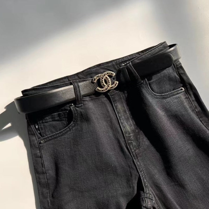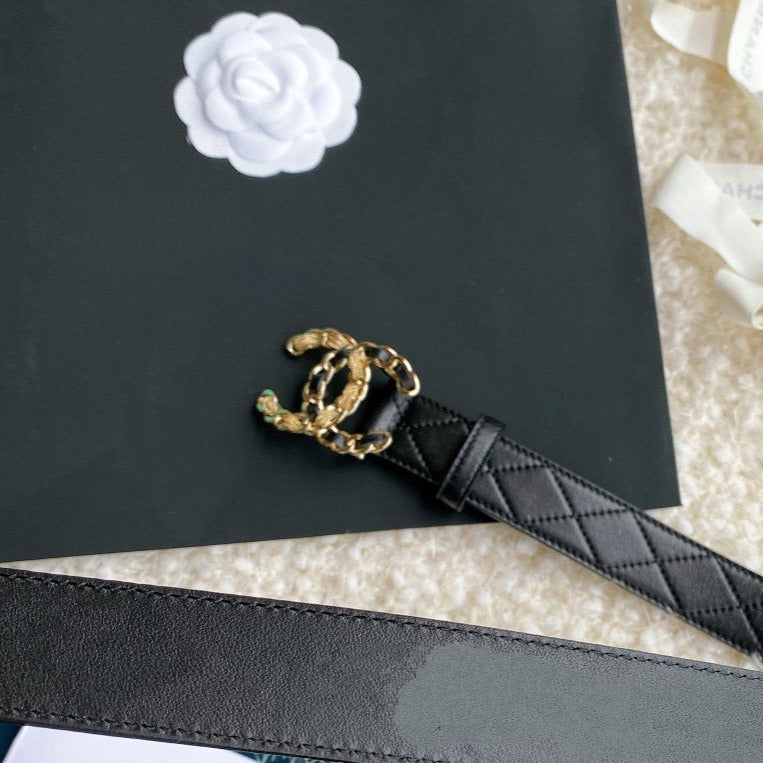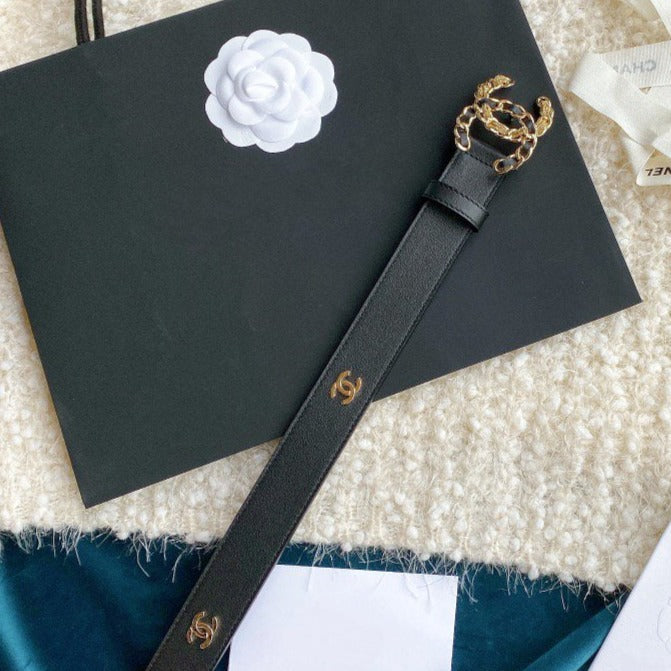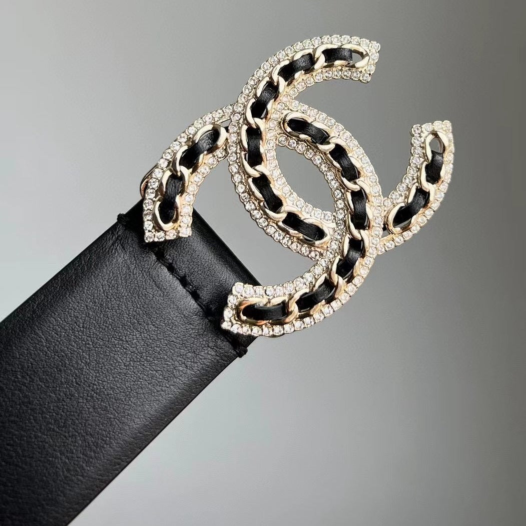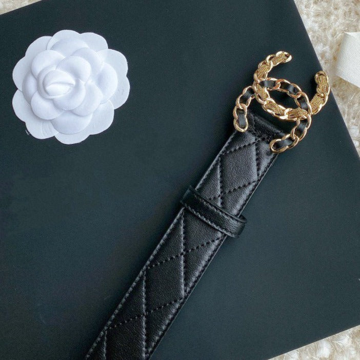 CC WOMEN'S BELT 3.0CM LEATHER BLACK BUCKLE GOLD DIAMOND