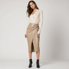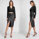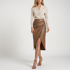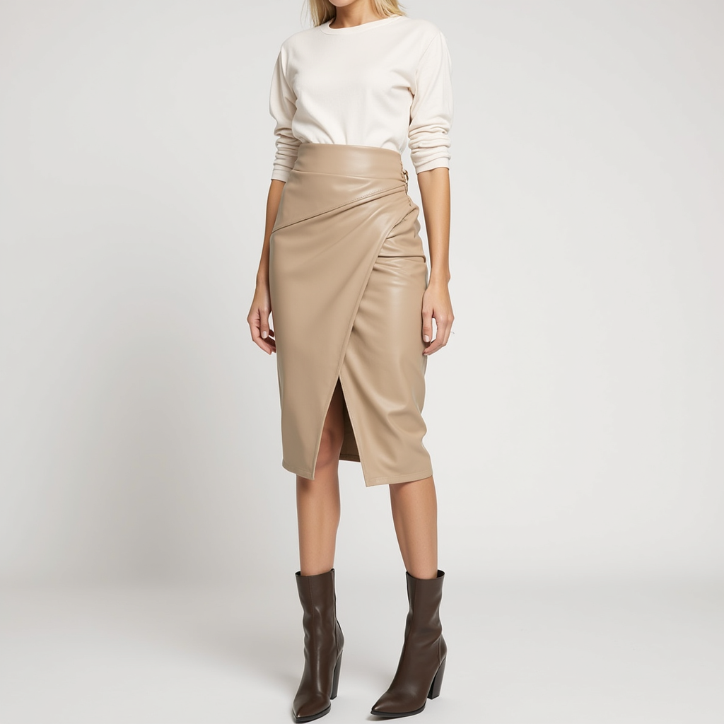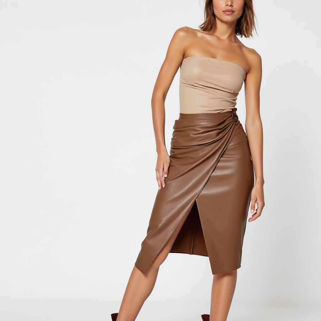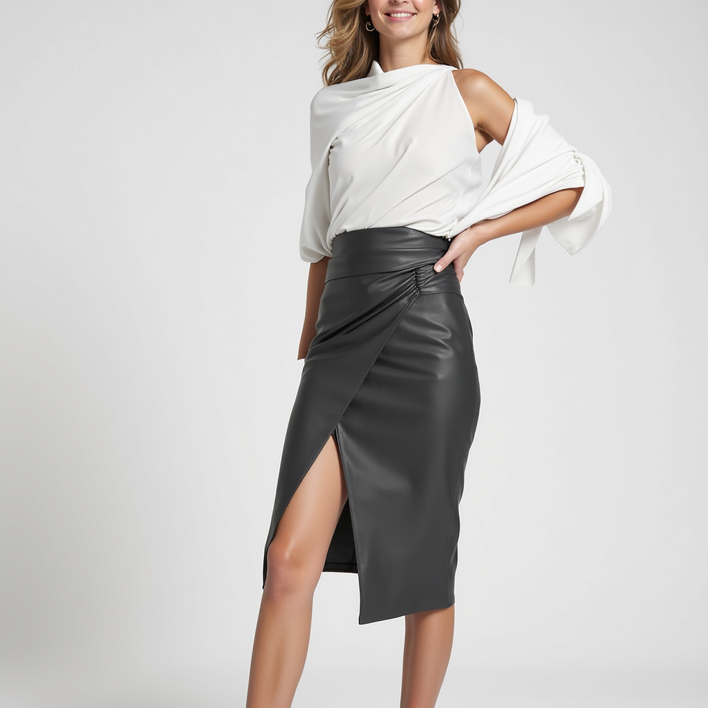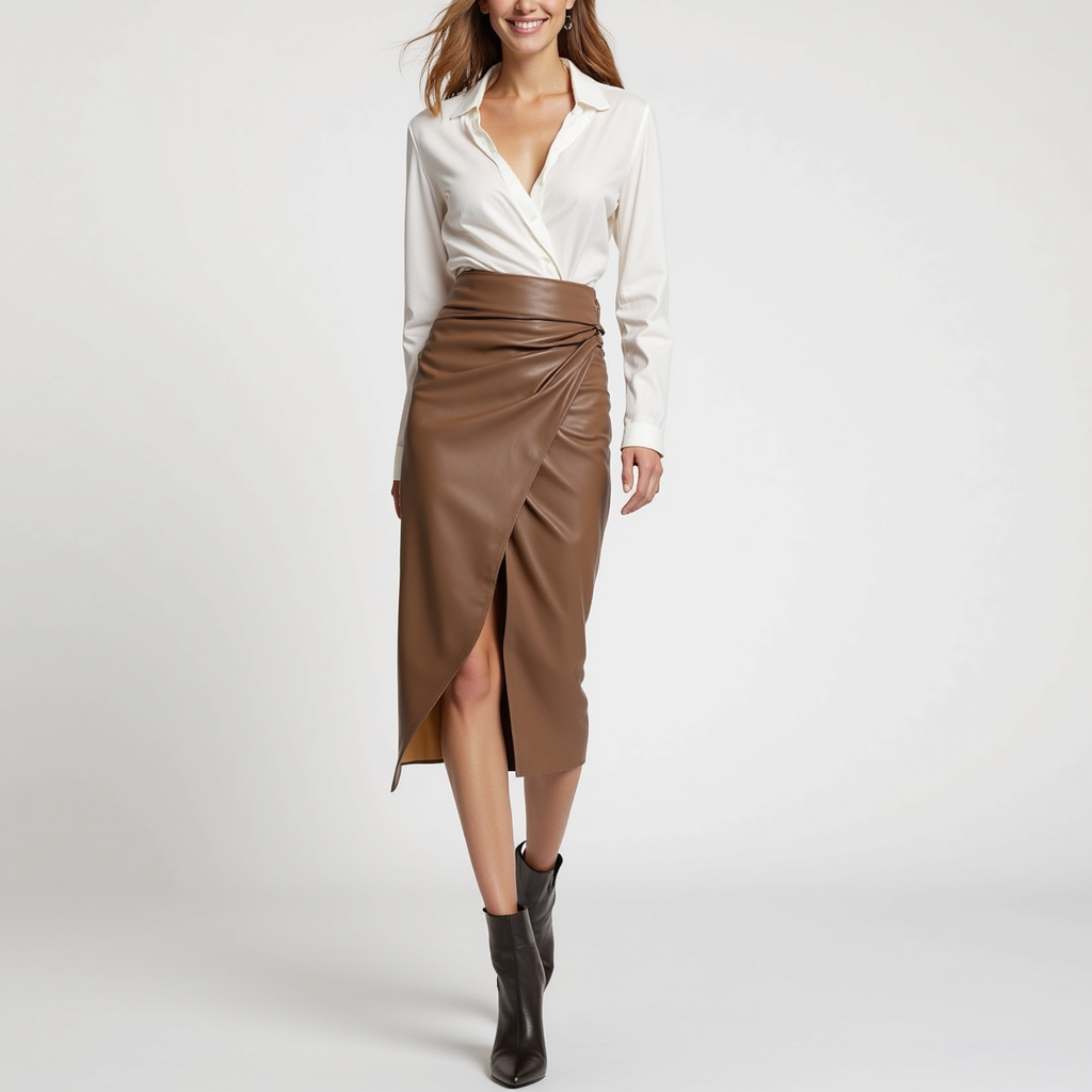 Dieser Rock ist nicht nur ein Kleidungsstück – er ist eine Aussage. Ob im Büro oder bei einem stilvollen Abendessen, der ModenGlanz Leder-Wickelrock verleiht jedem Look eine selbstbewusste Ausstrahlung. Der taillierte Schnitt und der markante Frontschlitz sorgen für eine elegante, feminine und gleichzeitig kraftvolle Silhouette.