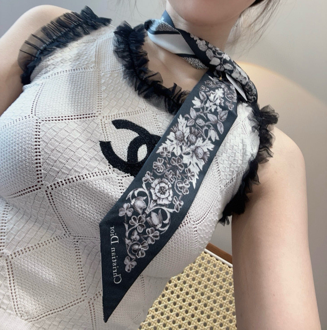 CD Twilly Mini Scarf 105cm White Black Mulberry Silk 968857
