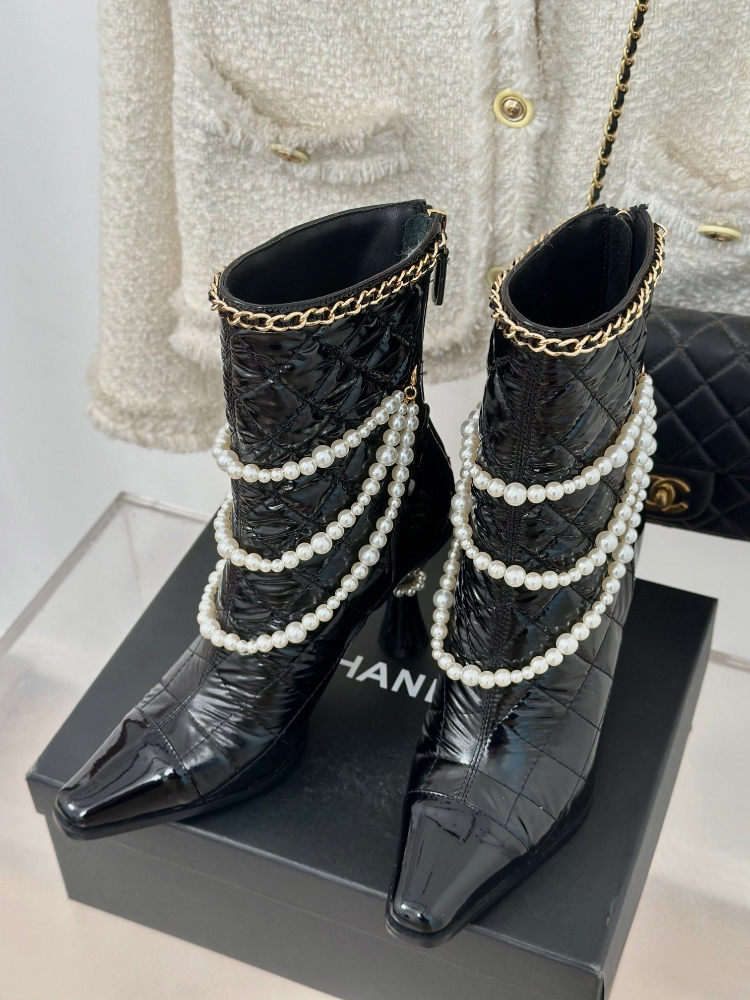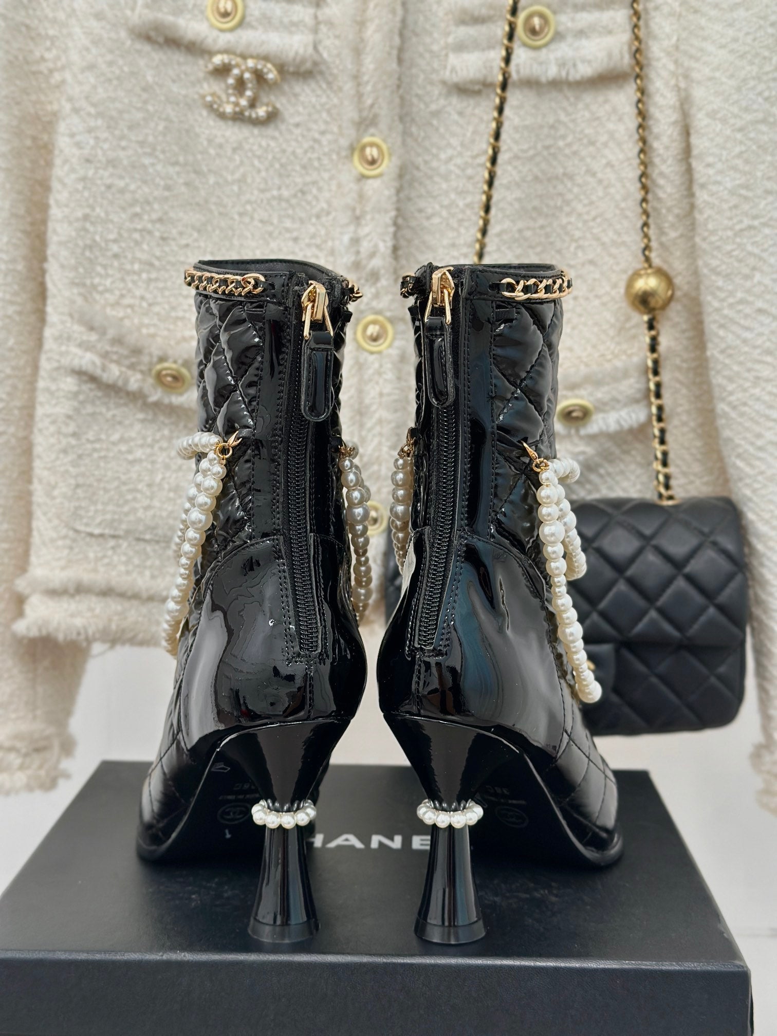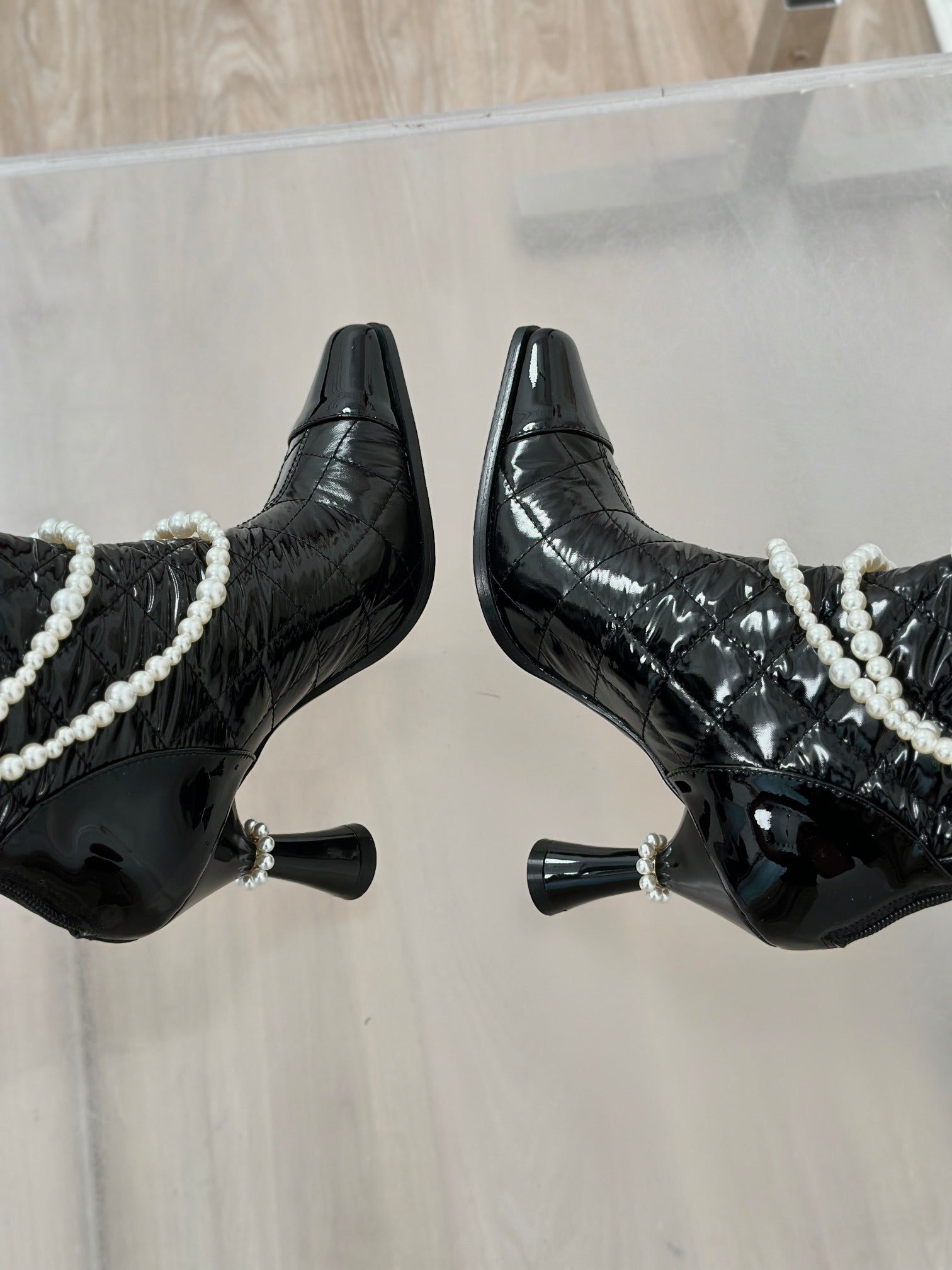 CC Short Boots 80mm Glossy Black Wrinkled Quilted Calfskin