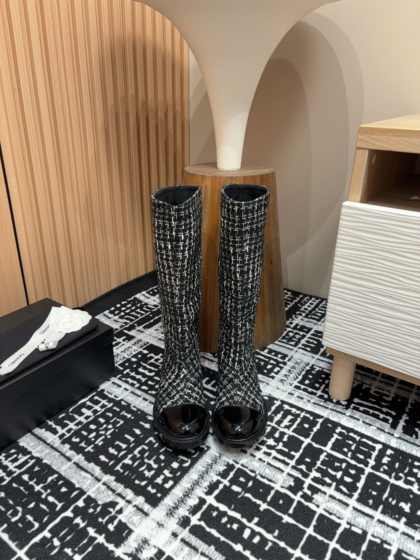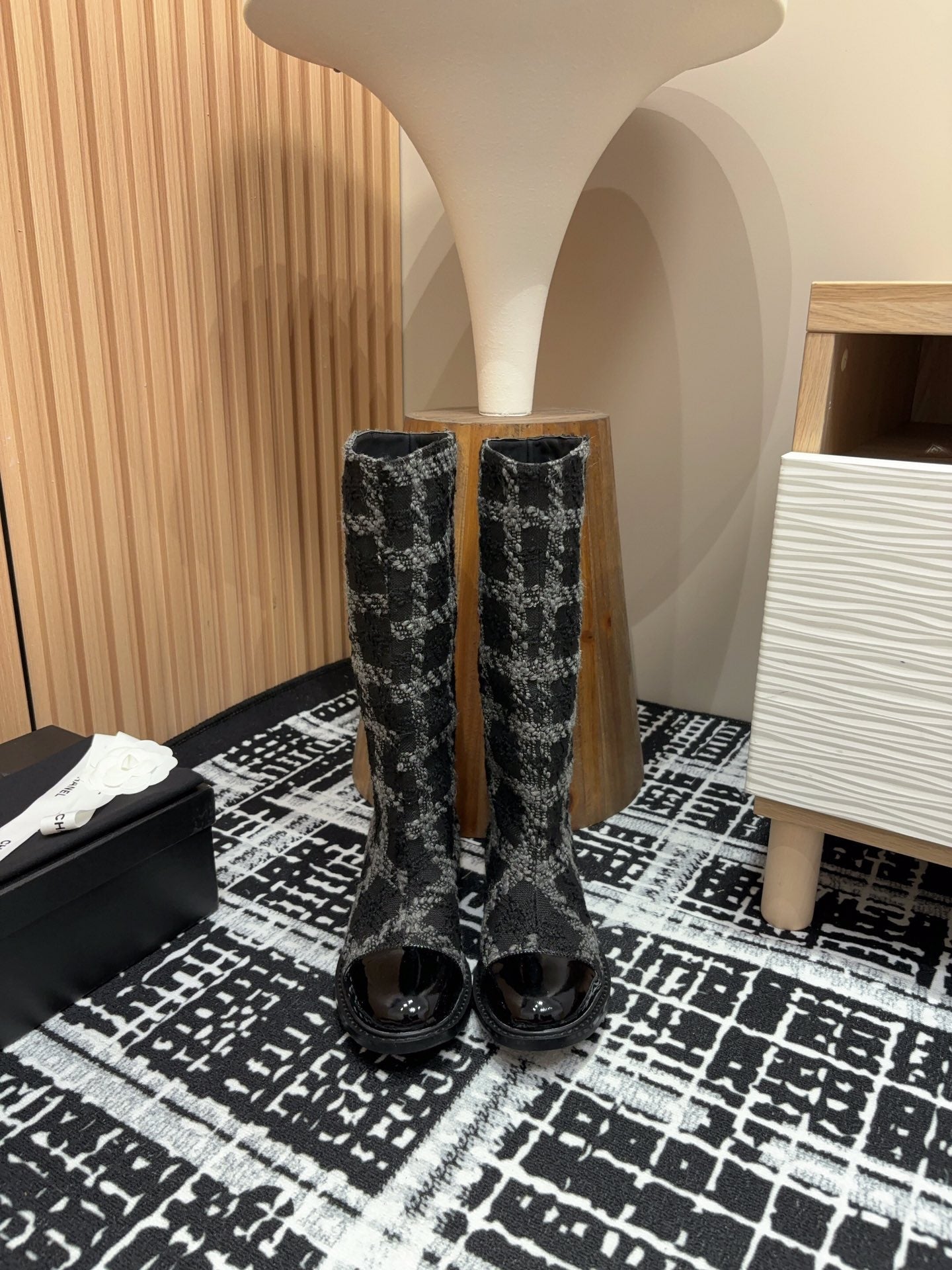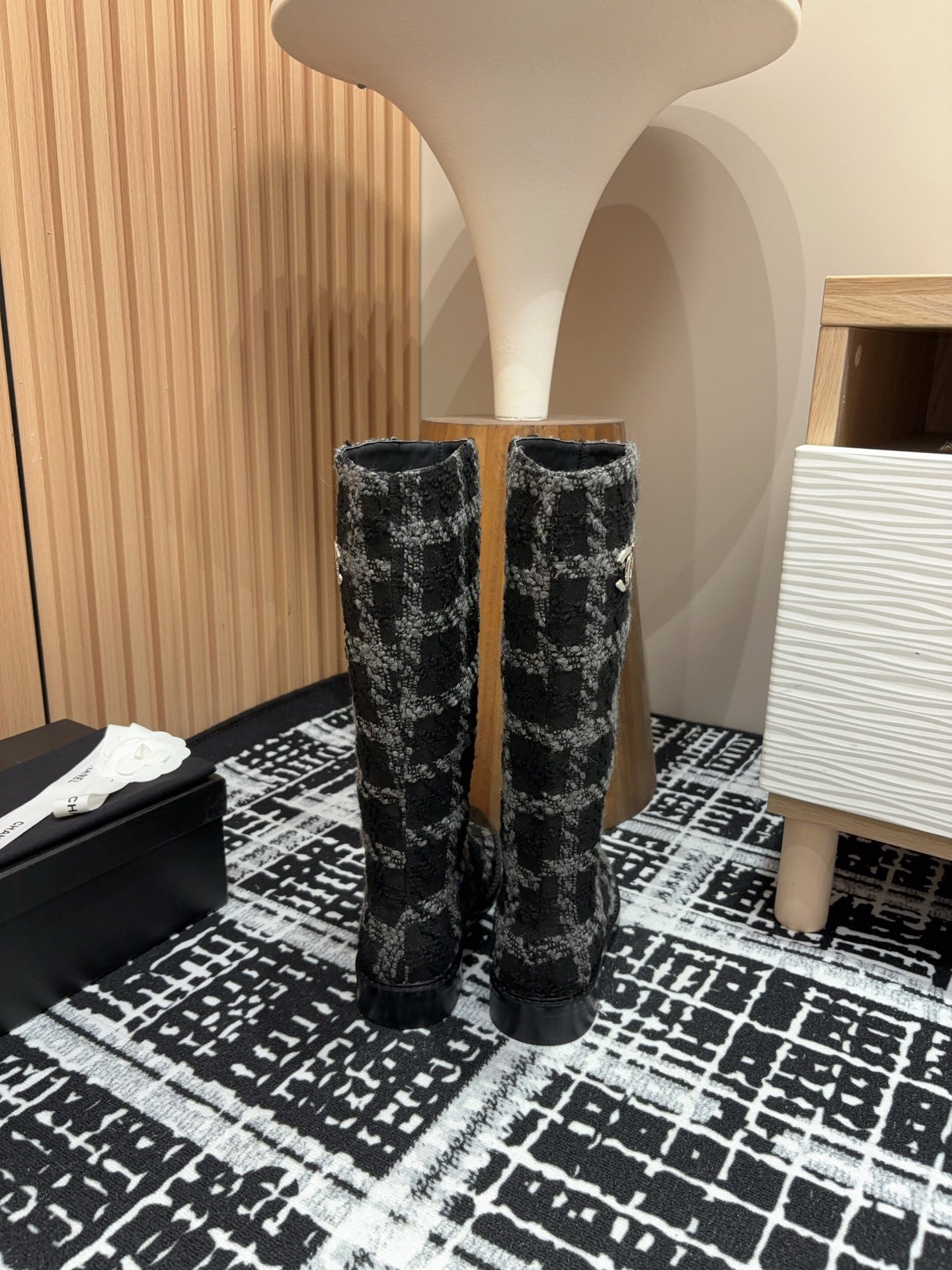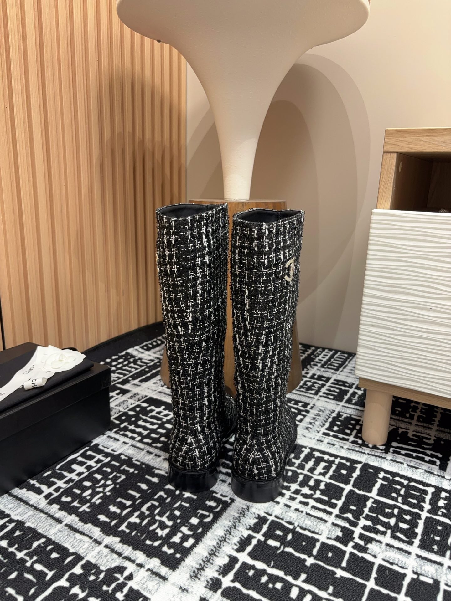CC High Boots In White Mix Black Wool Tweed And Lambskin