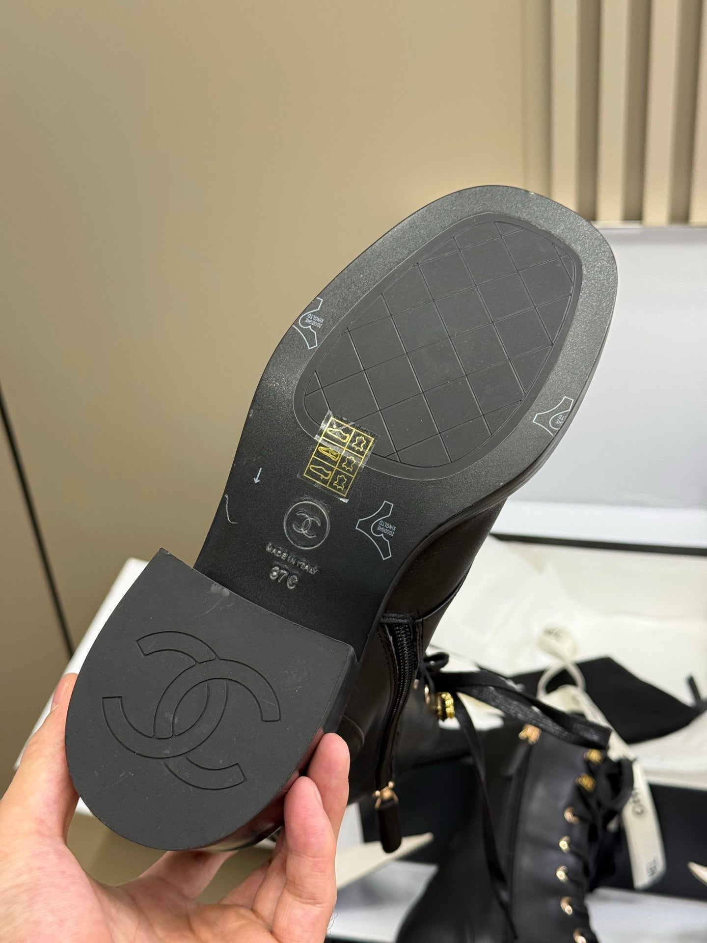 CC 25 High Boot Beige Calfskin Black Grosgrain 430337