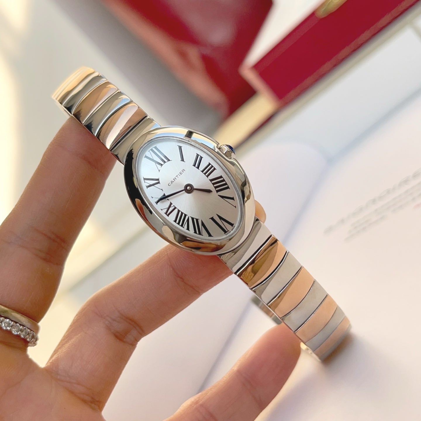 Baignoire 23mm Pink Gold Case Diamond Bezel Red Leather Strap