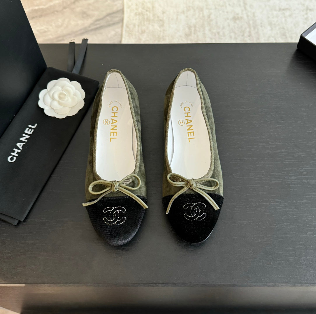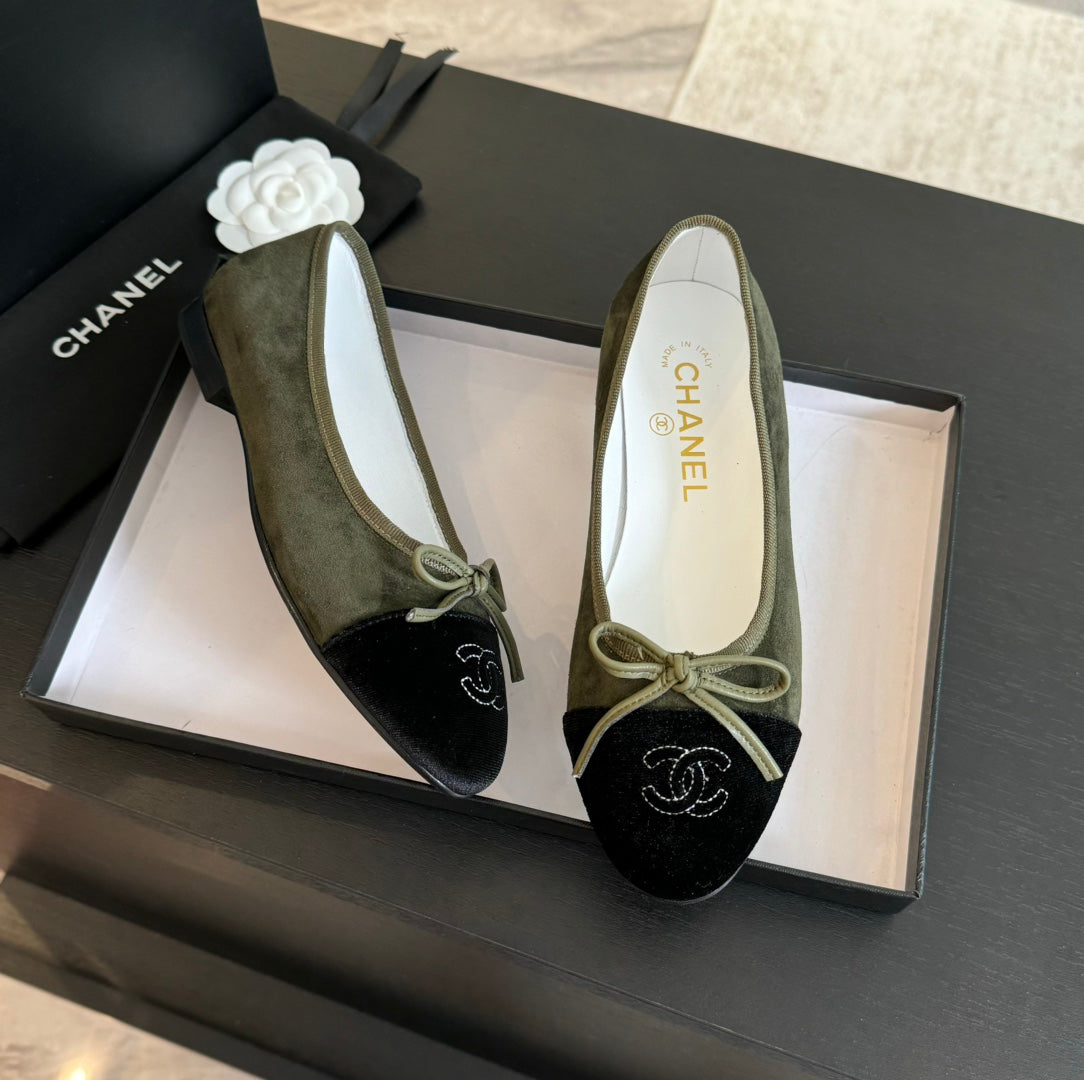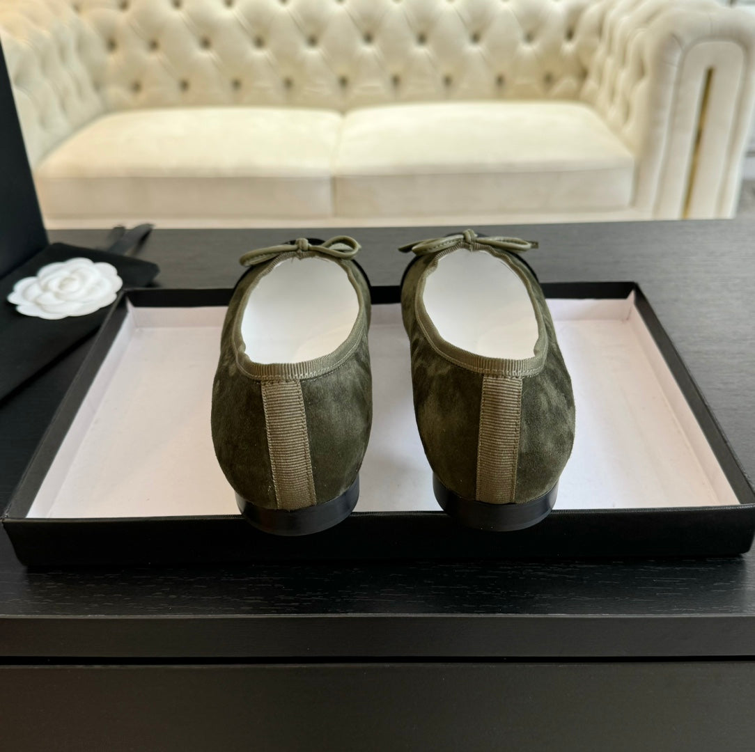 ballet flat moss green suede and black canvas