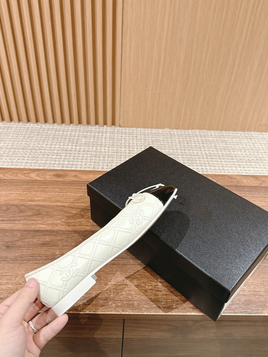 ballet flat cream quilted lambskin black patent calfskin
