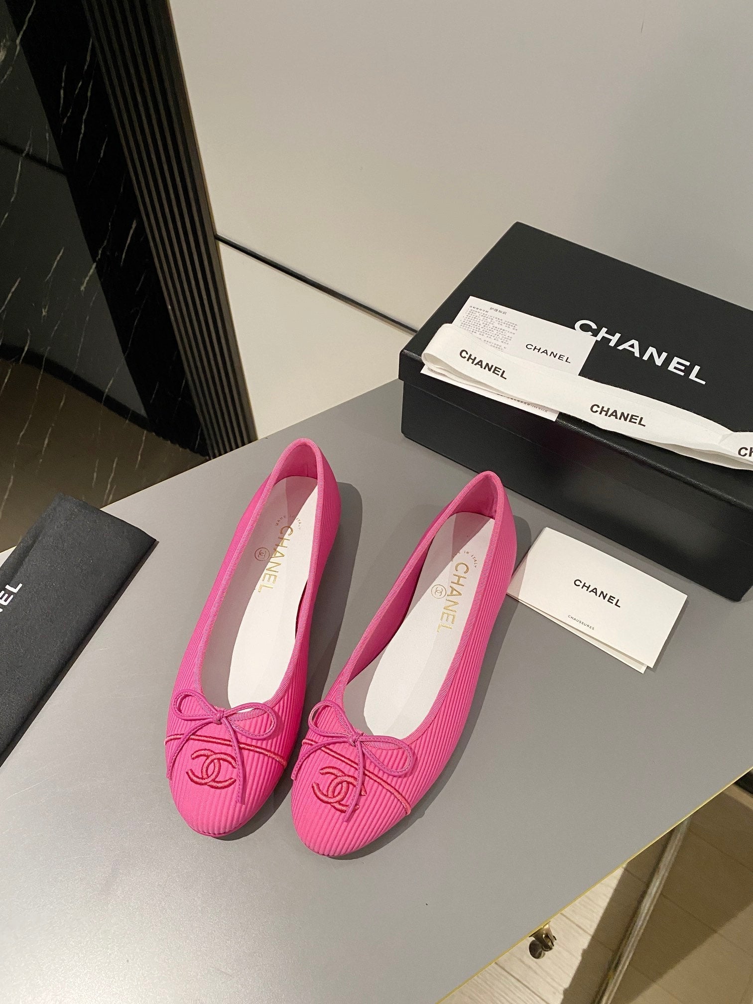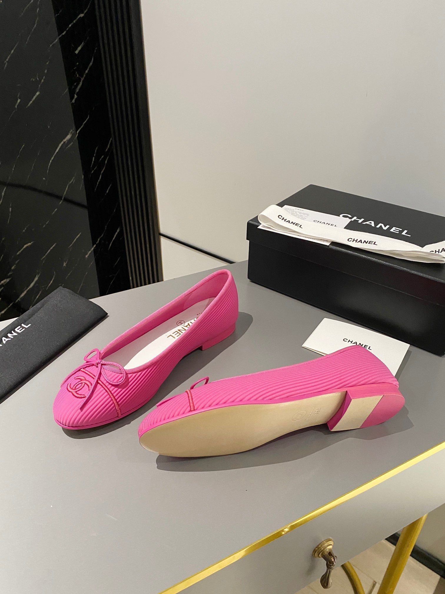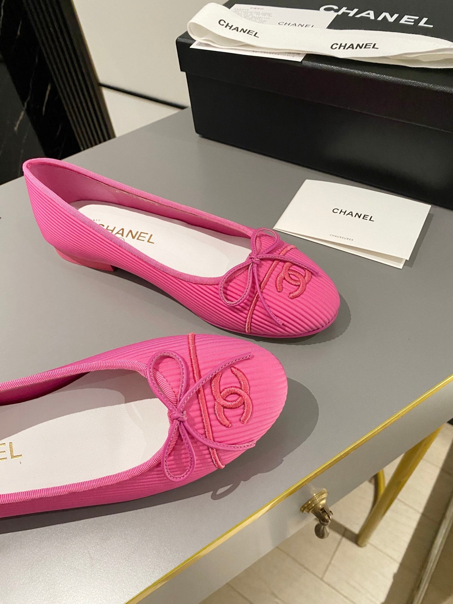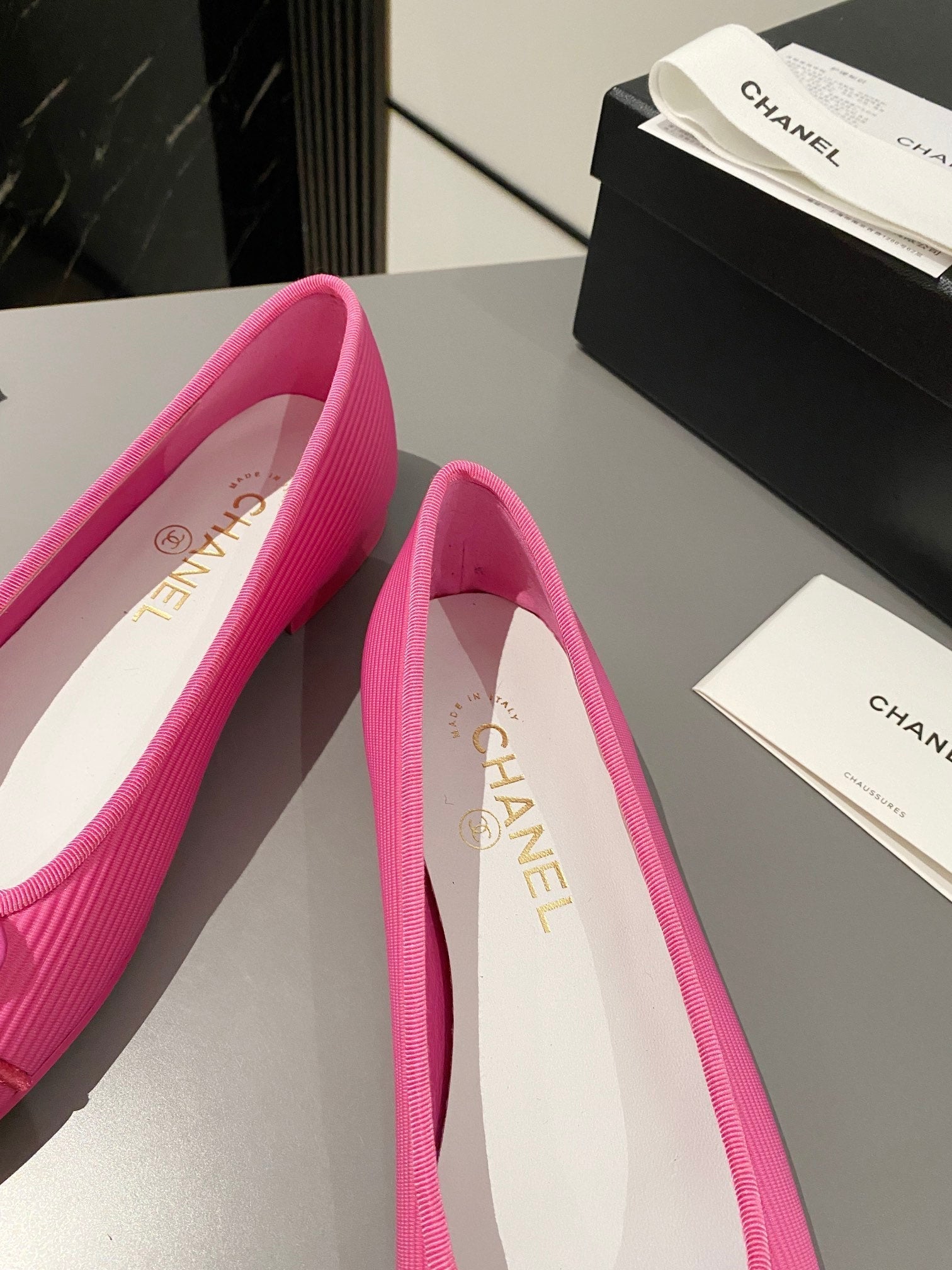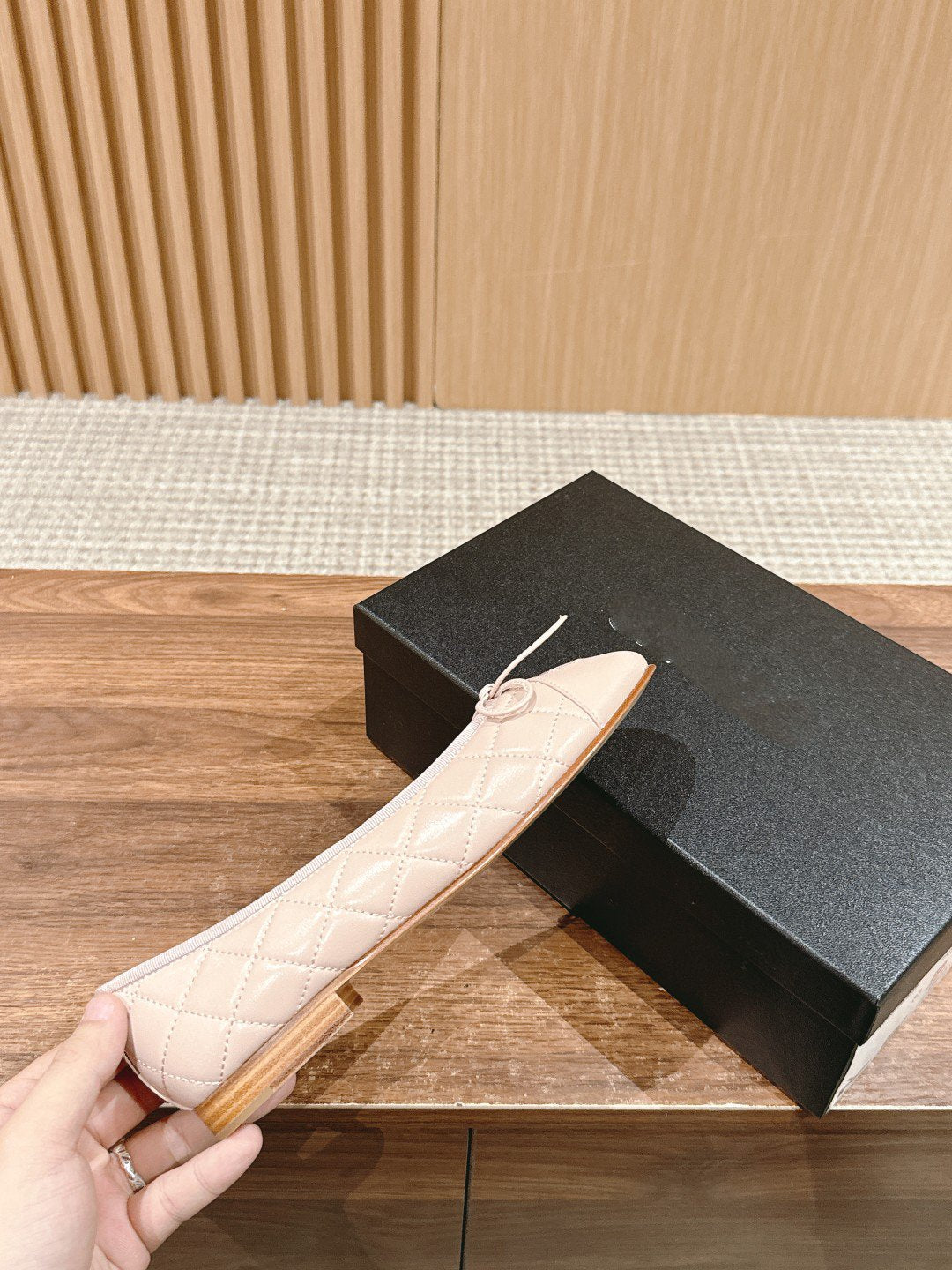 ballet flat beige lambskin black leather chain grosgrain