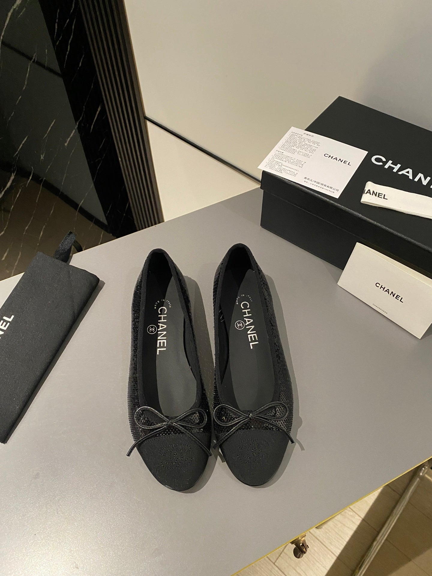 ballet flat black glitter sequins grosgrain