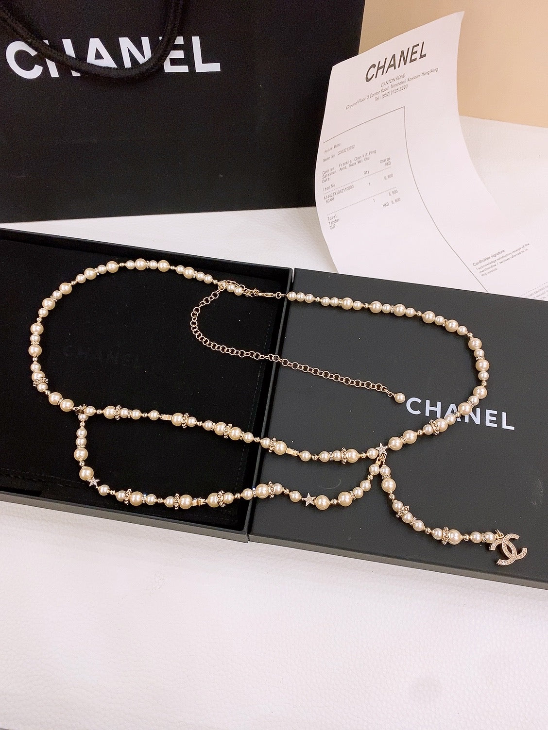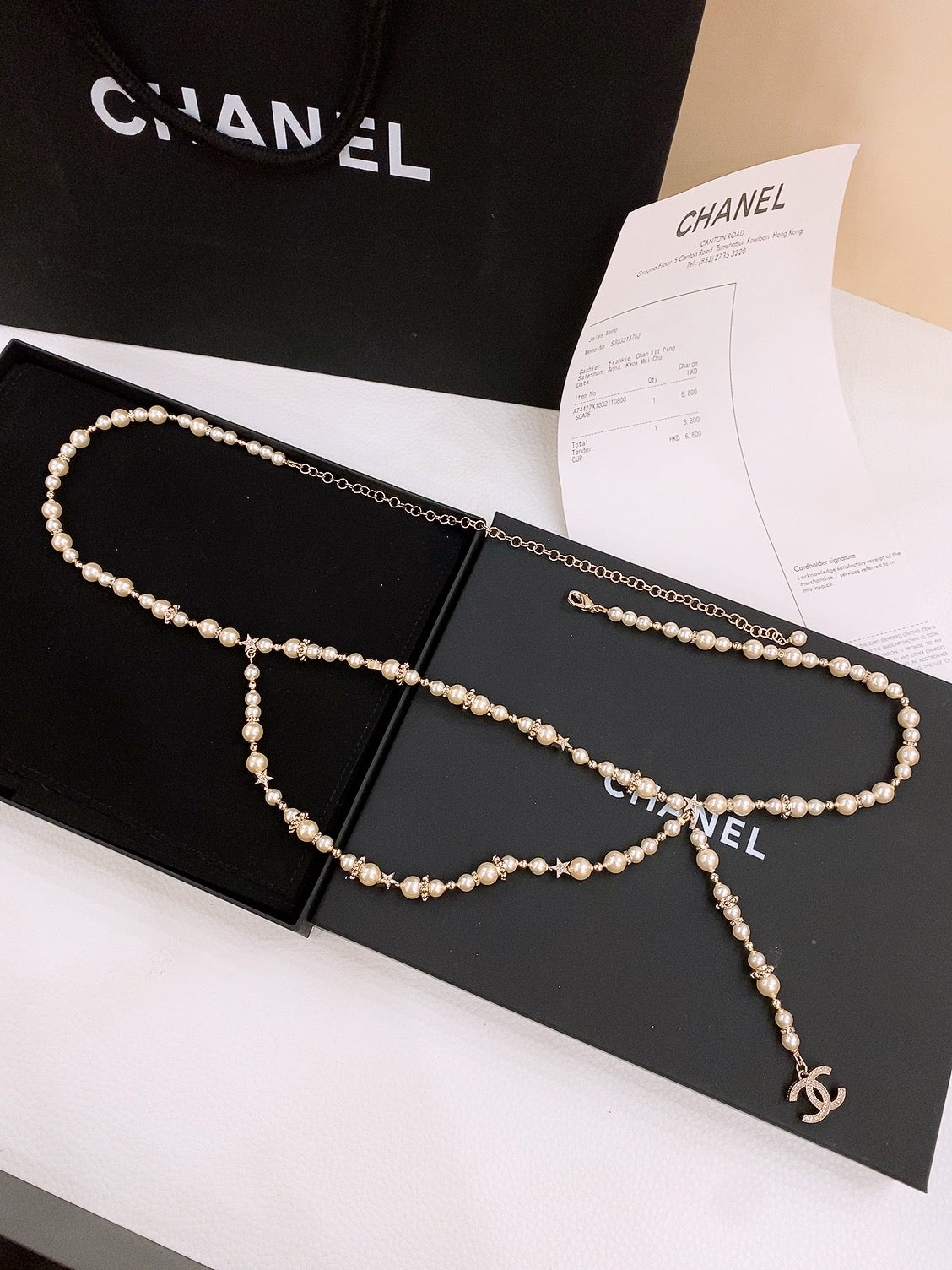CHANEL Faux Pearl Chain Fancy Belt Gold Interlocking