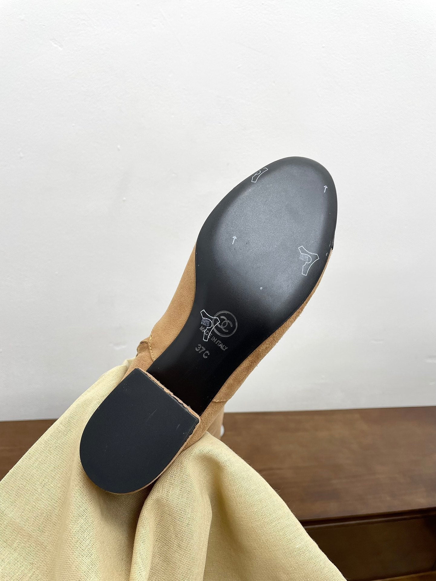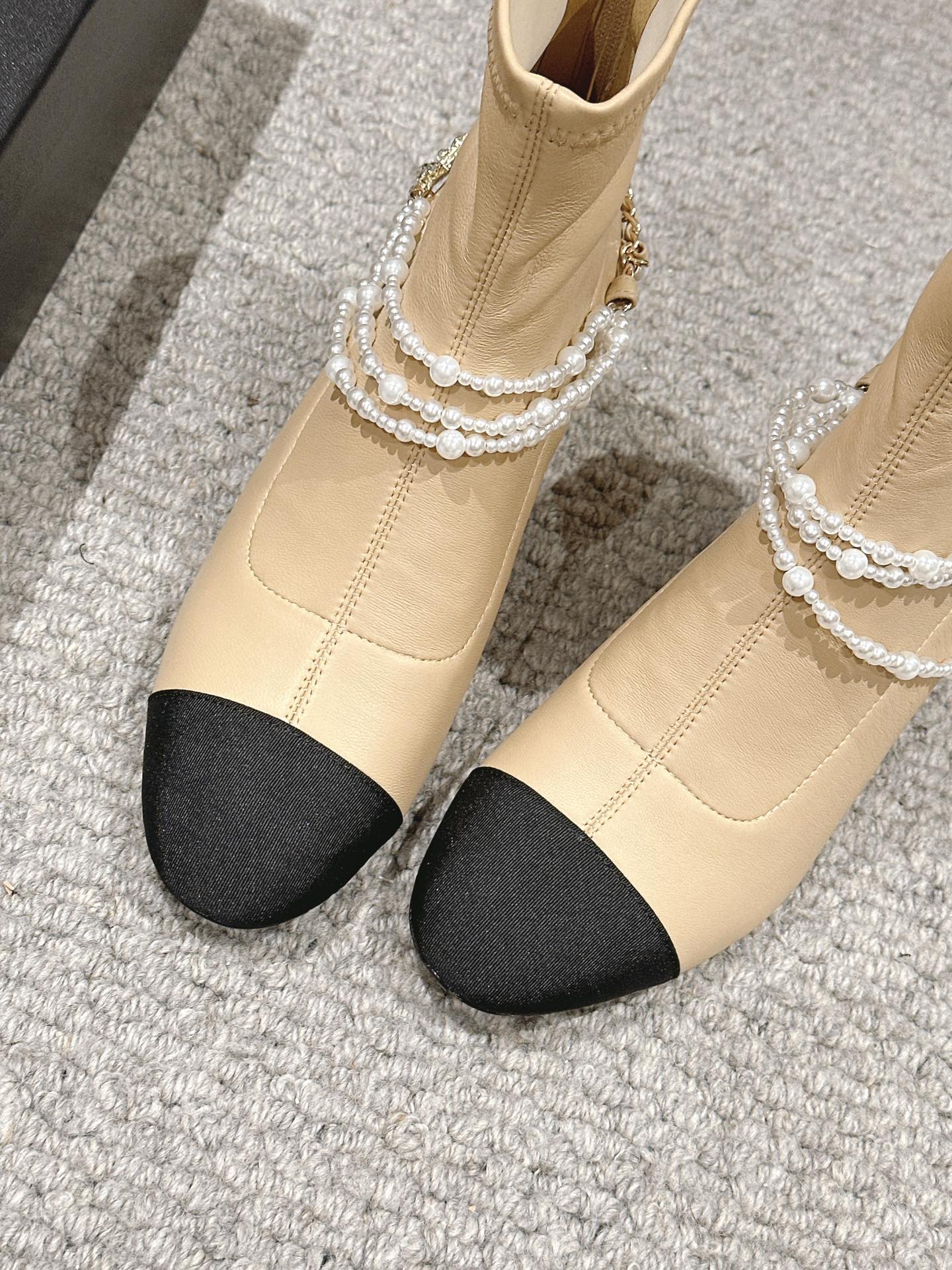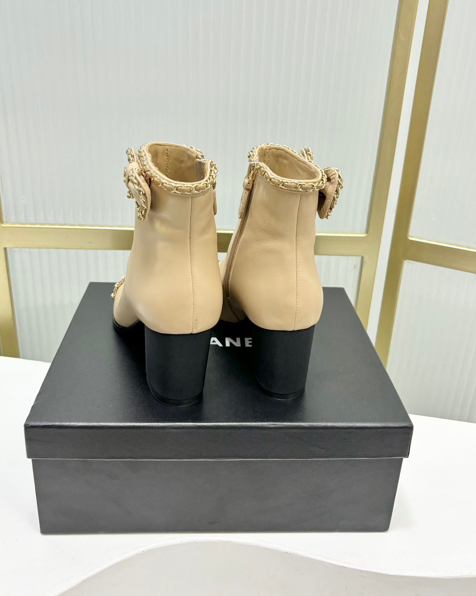 CC LOW CUT BOOTS IN SEPIA BEIGE STRETCH LAMBSKIN AND GROSGRAIN WITH PEARL CHAIN
