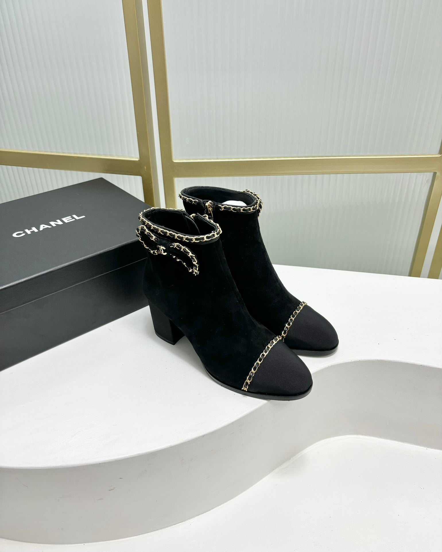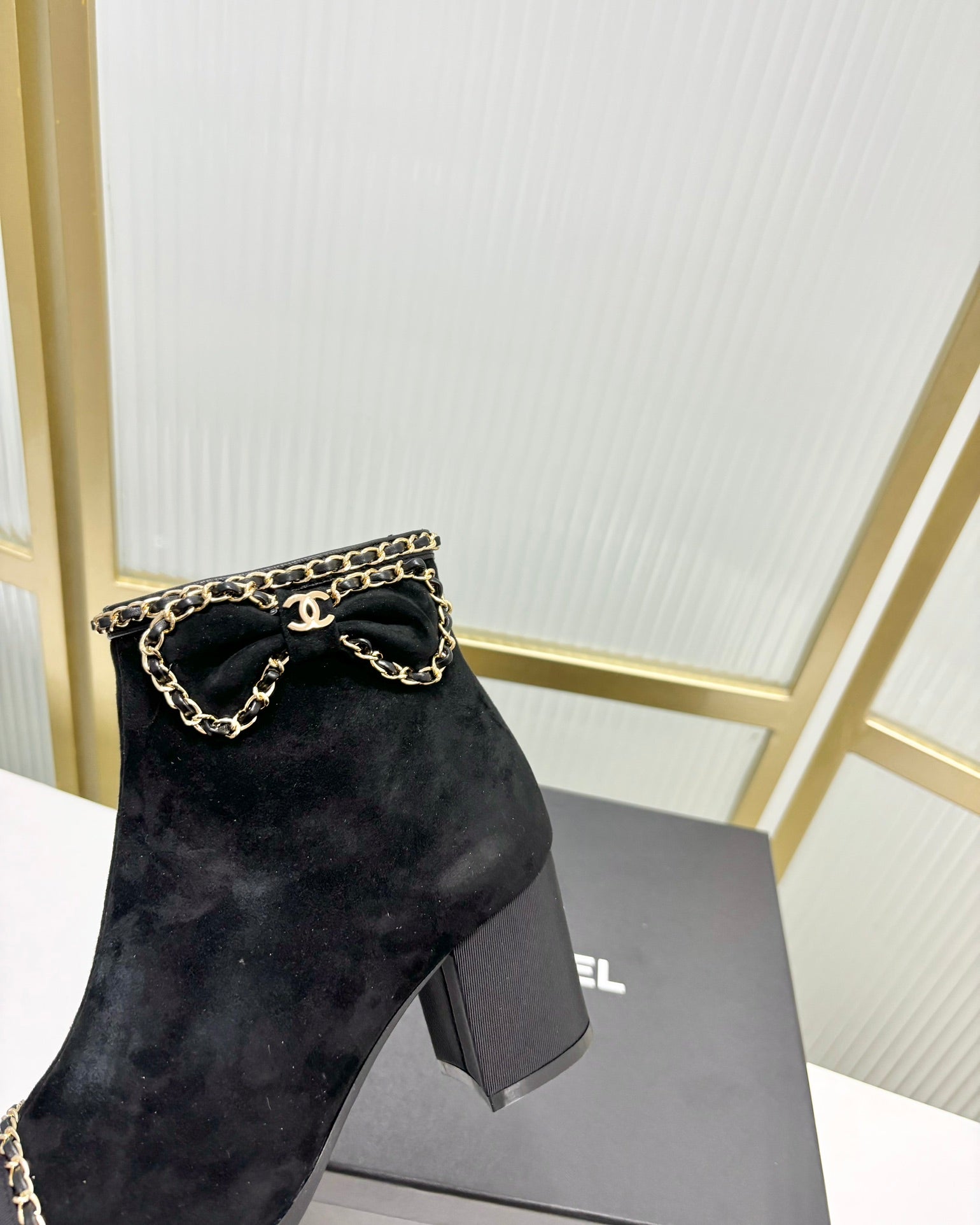 CC LOW CUT BOOTS IN BLACK STRETCH LAMBSKIN AND GROSGRAIN WITH PEARL CHAIN