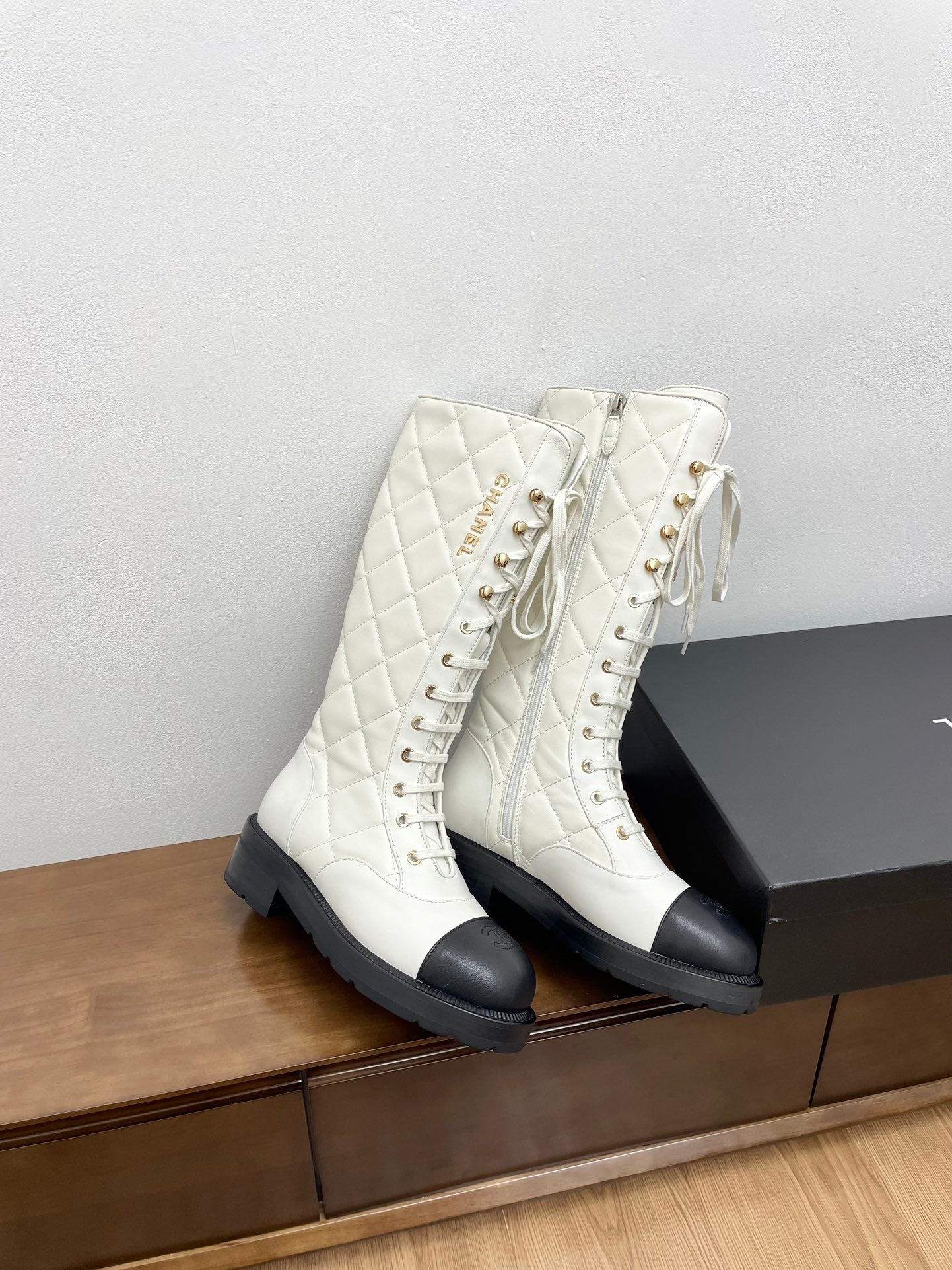 CC COMBAT BOOTS IN WHITE WRINKLED CALFSKIN AND BLACK GROSGRAIN WITH FAUX PEARL