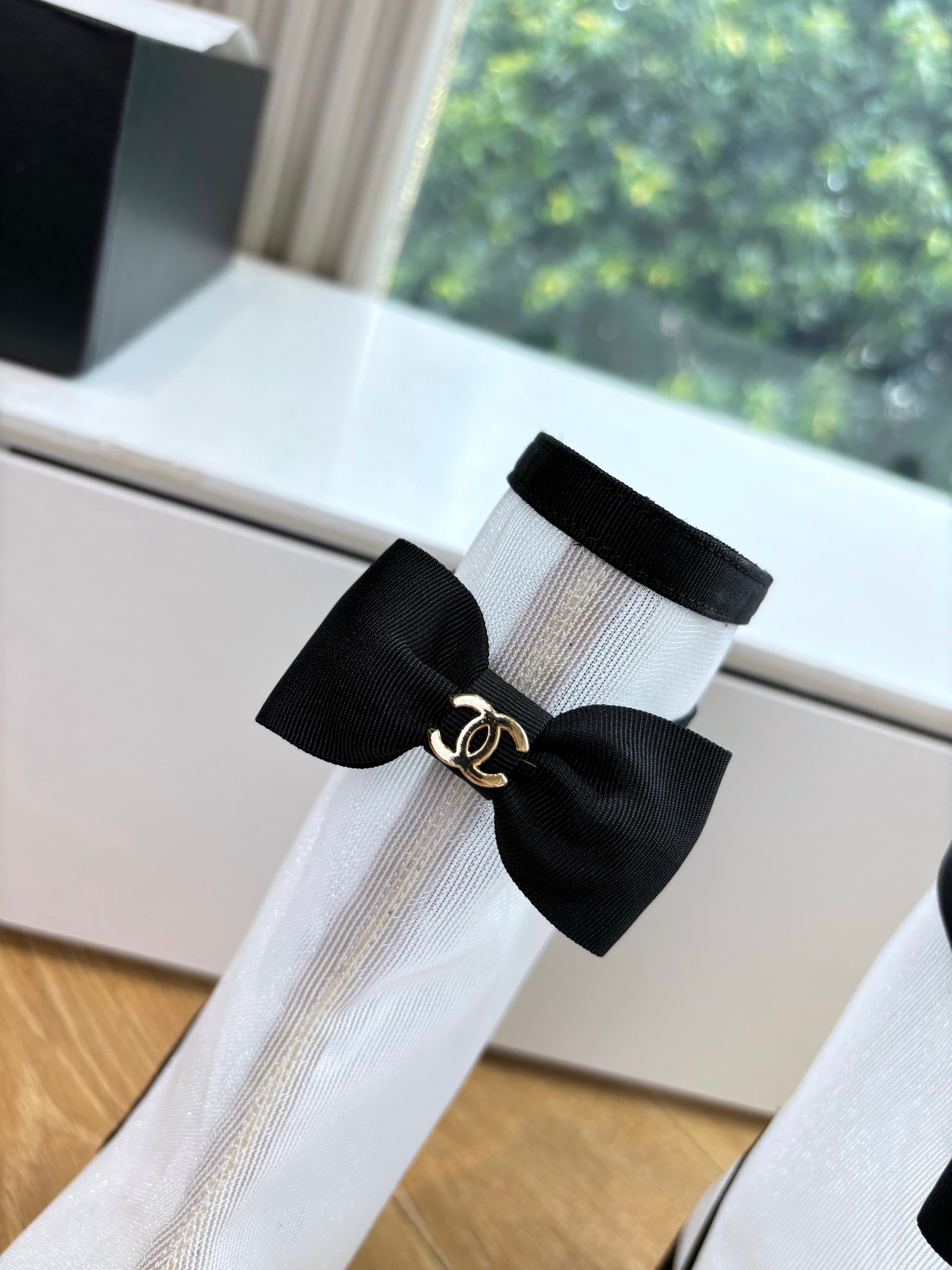 CC 25 Short Boot White Calfskin Black Bow 430317