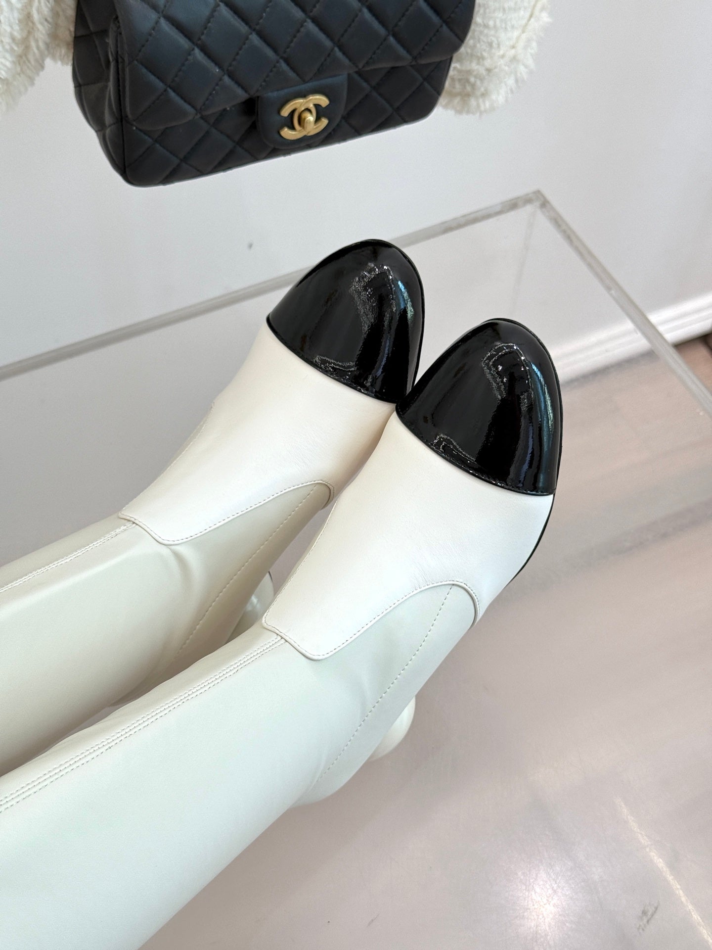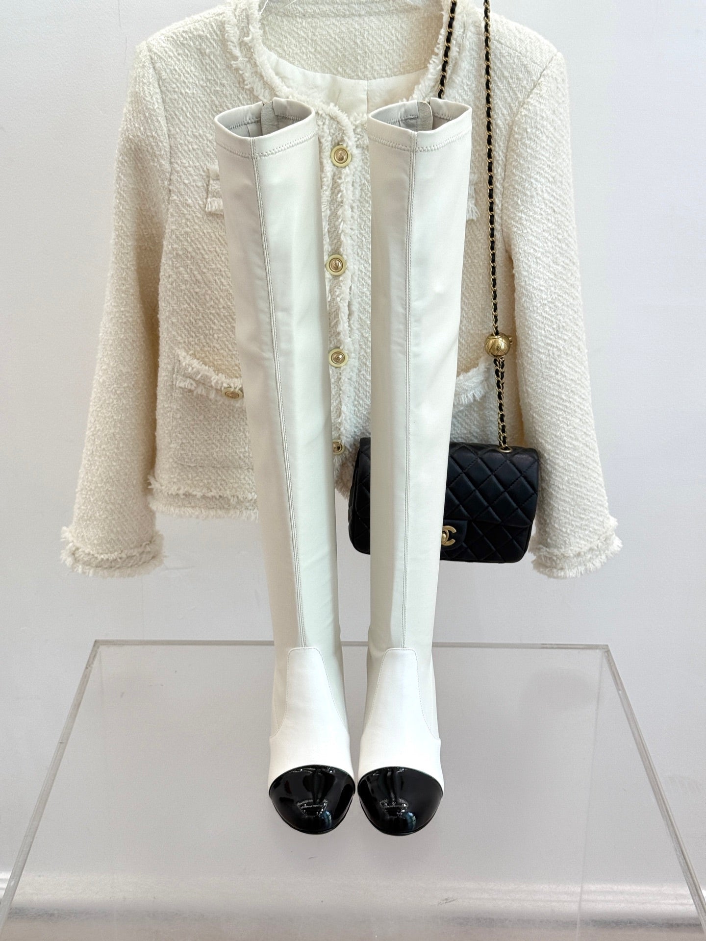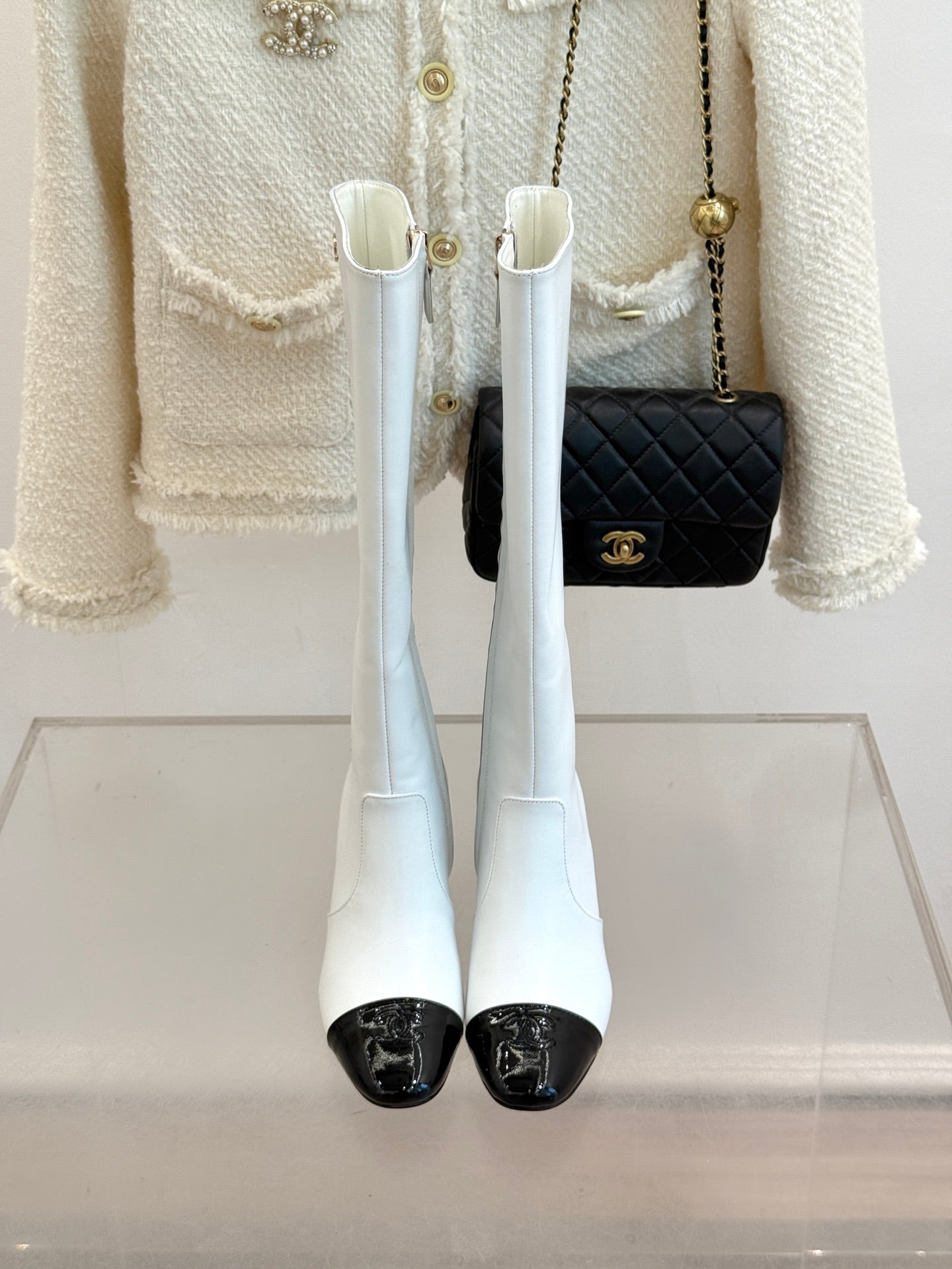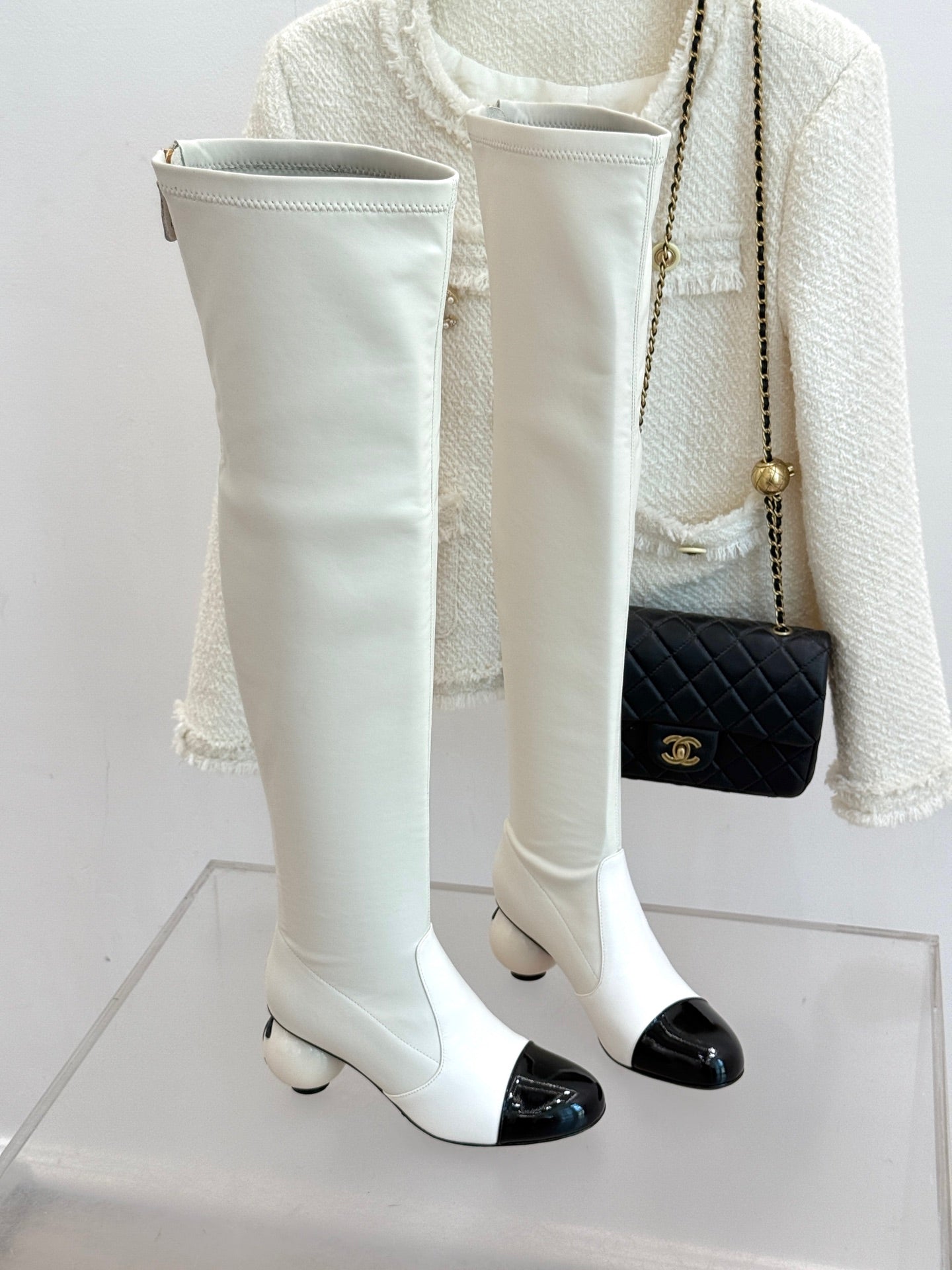 Chanel 25 Double C Giant Pearl Heel Long Boot White Black Sheepskin 465412