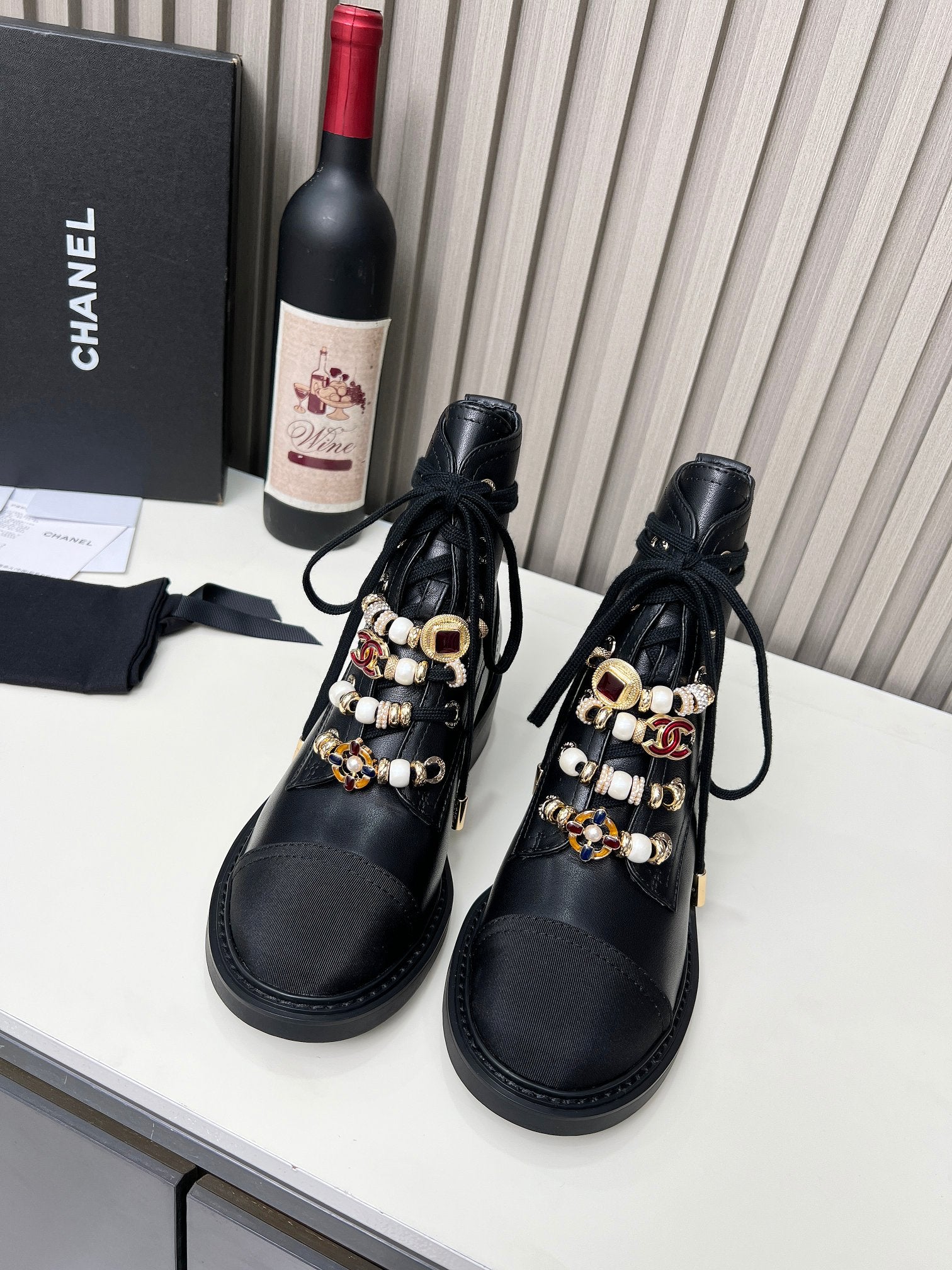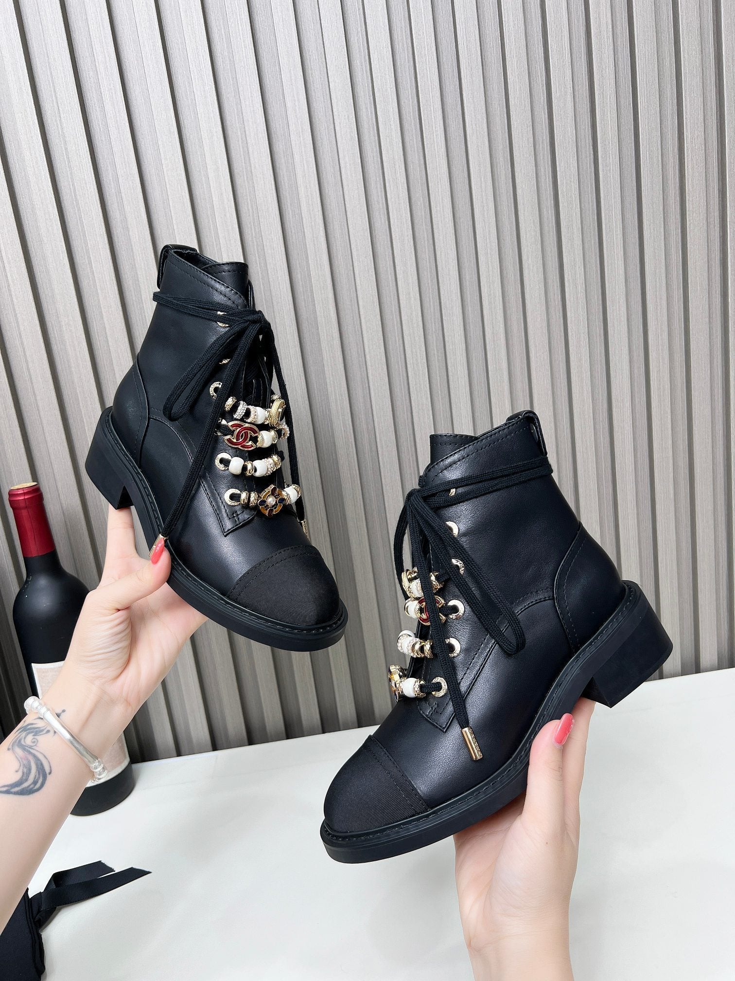 CC Combat Boots 50mm In Black Glossy Calfskin Quilted And Lycra Fabric 940073